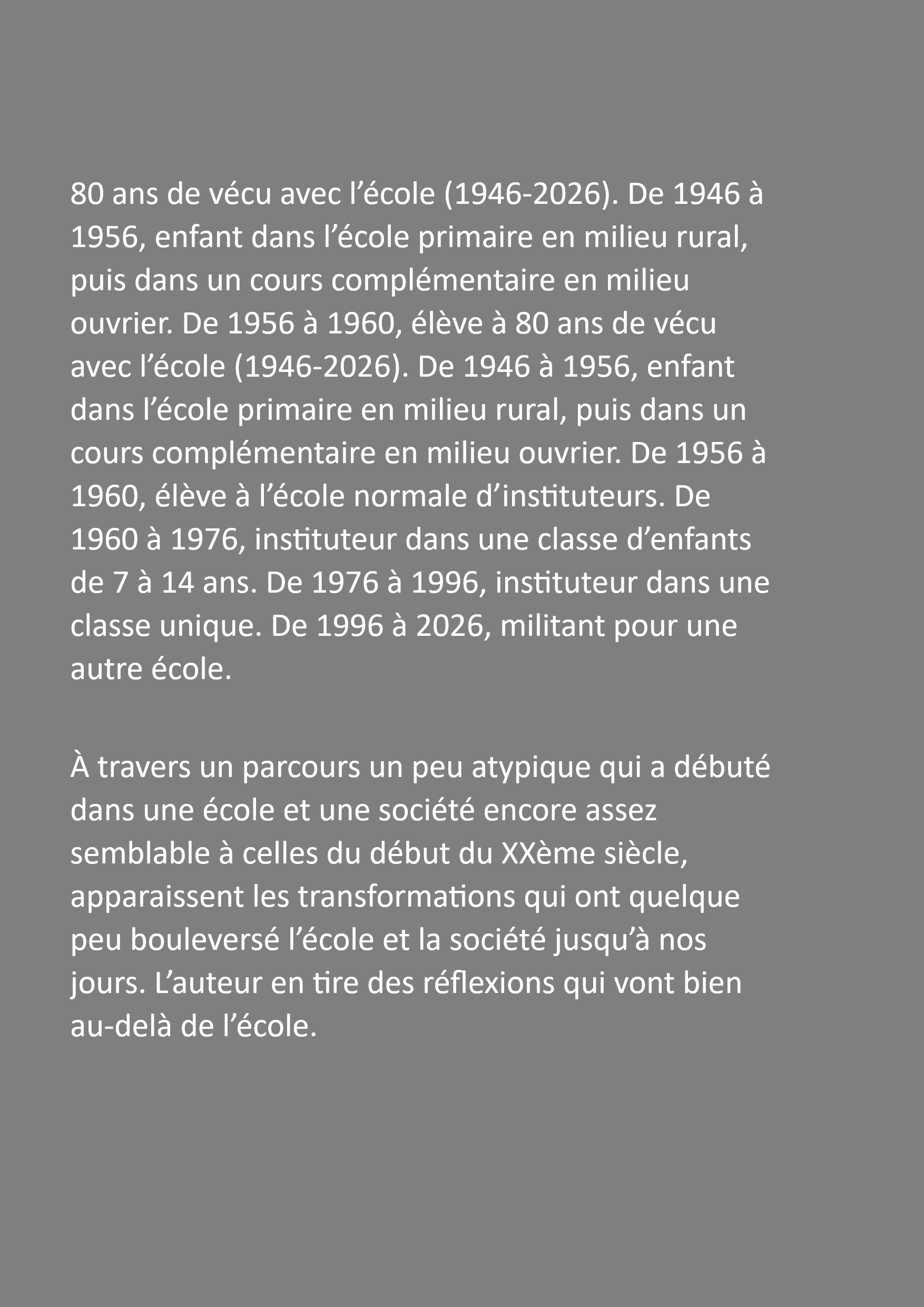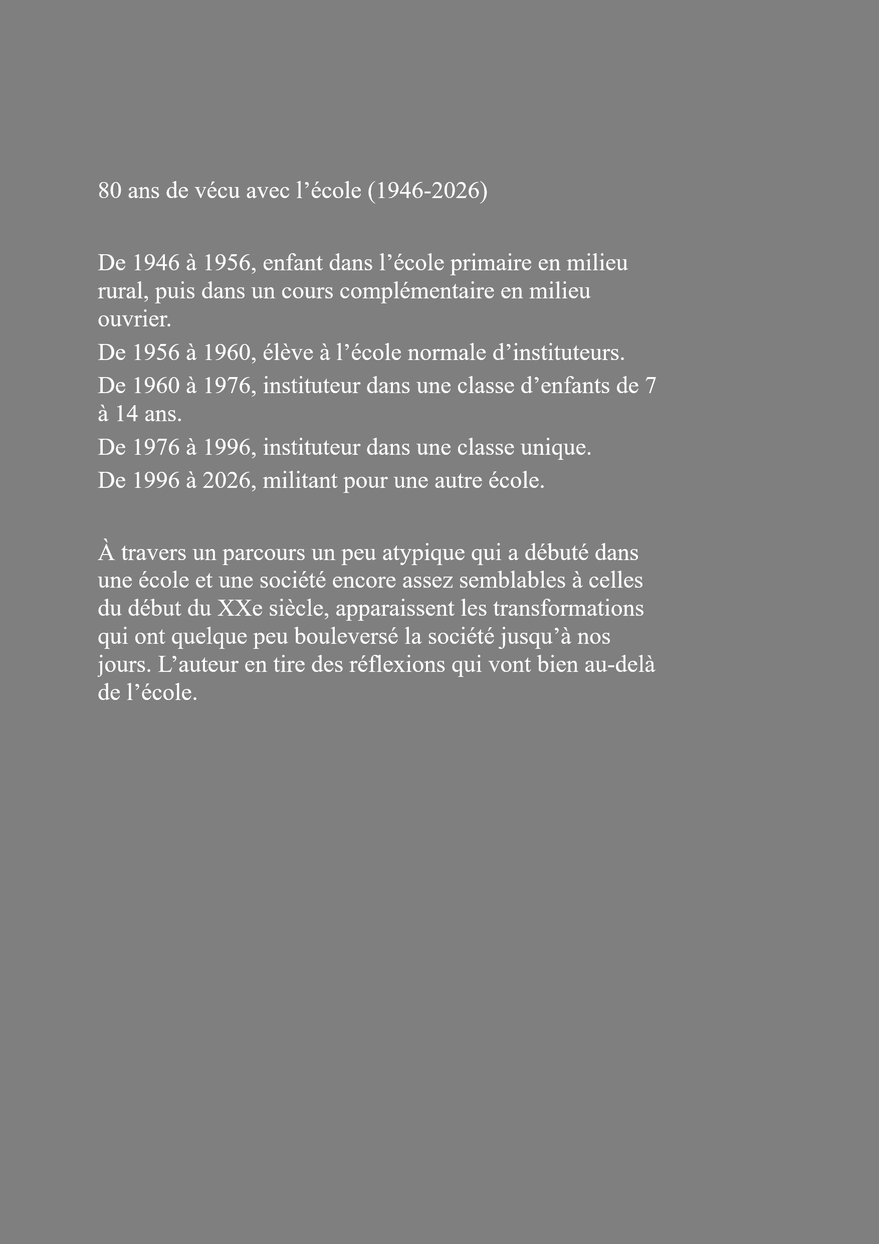 L'ouvrage retrace 80 ans de vécu avec l’école (1946-2026). De 1946 à 1956, enfant dans l’école primaire en milieu rural, puis dans un cours complémentaire en milieu ouvrier. De 1956 à 1960, élève à l’école normale d’instituteurs. De 1960 à 1976, instituteur dans une classe d’enfants de 7 à 14 ans. De 1976 à 1996, instituteur dans une classe unique. De 1996 à 2026, militant pour une autre école.