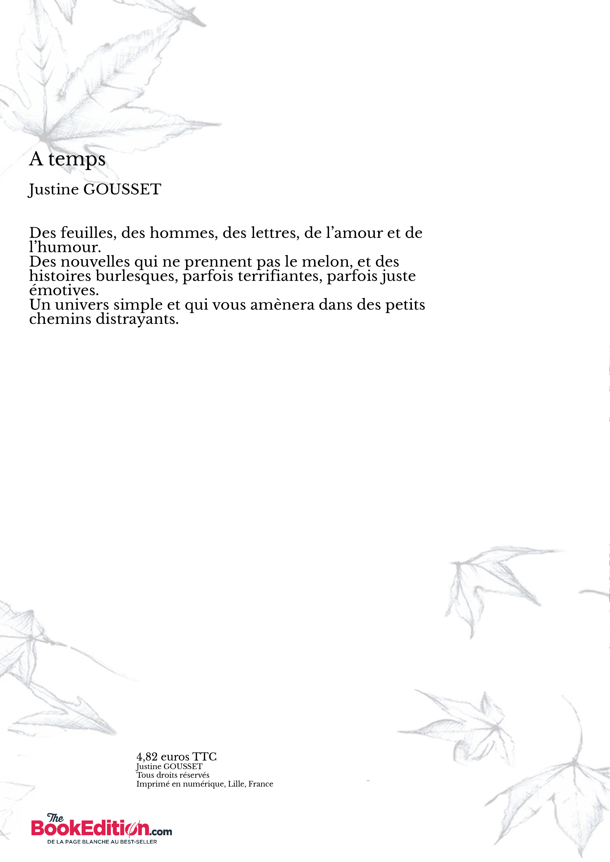 Des feuilles, des hommes, des lettres, de l’amour et de l’humour. Des nouvelles qui ne prennent pas le melon, et des histoires burlesques, parfois terrifiantes, parfois juste émotives. Un univers simple et qui vous amènera dans des petits chemins distrayants.