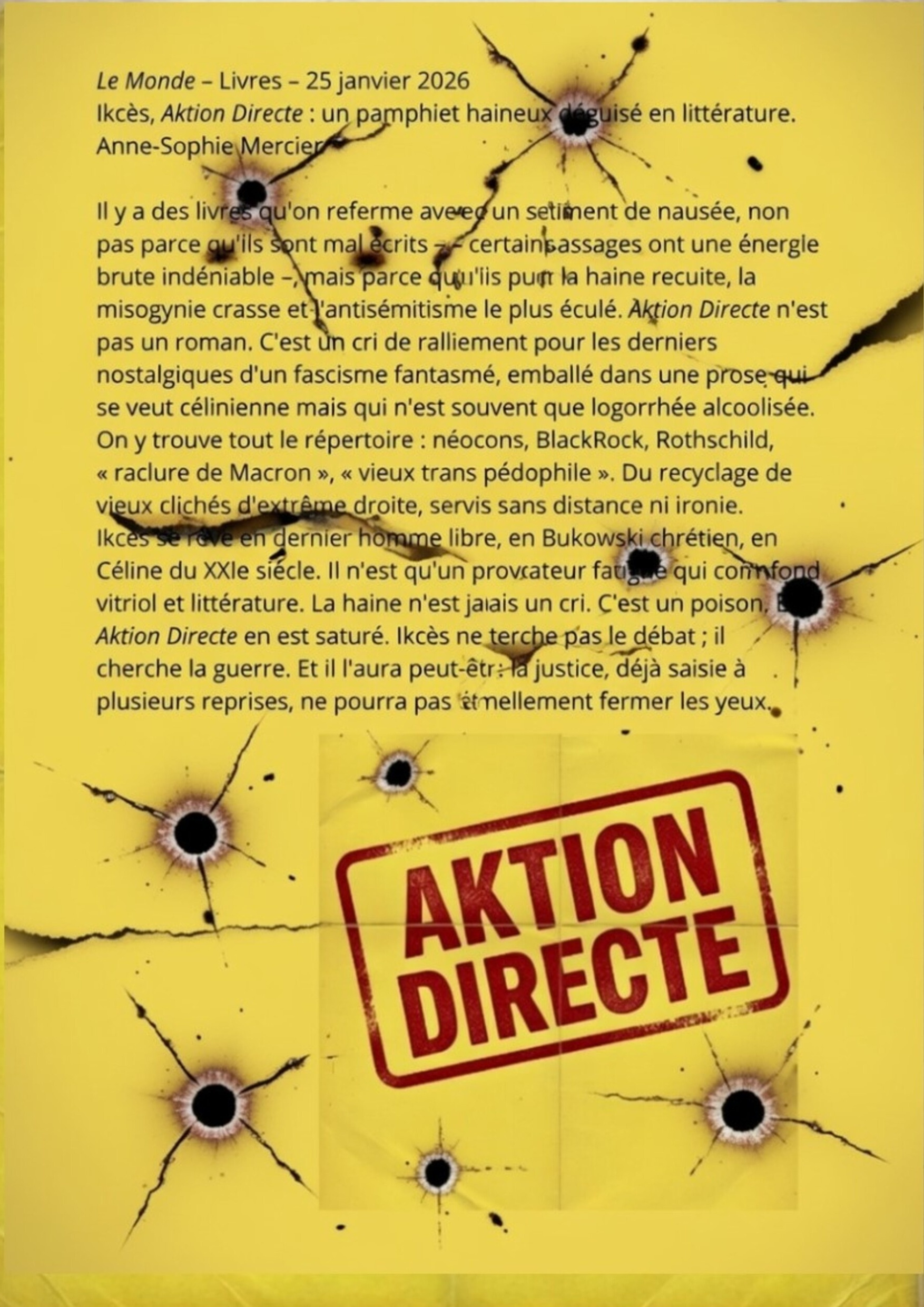 Il y a des livres qu'on referme avec un sentiment de nausée, non pas parce qu'ils sont mal écrits – certains passages ont une énergie brute indéniable –, mais parce qu'ils puent la haine recuite, la misogynie crasse et l'antisémitisme le plus éculé. Aktion Directe n'est pas un roman. C'est un cri de ralliement pour les derniers nostalgiques d'un fascisme fantasmé, emballé dans une prose qui se veut célinienne mais qui n'est souvent que logorrhée alcoolisée. On y trouve tout le répertoire : néocons, BlackRock, Rothschild, « raclure de Macron », « vieux trans pédophile ». Du recyclage de vieux clichés d'extrême droite, servis sans distance ni ironie.