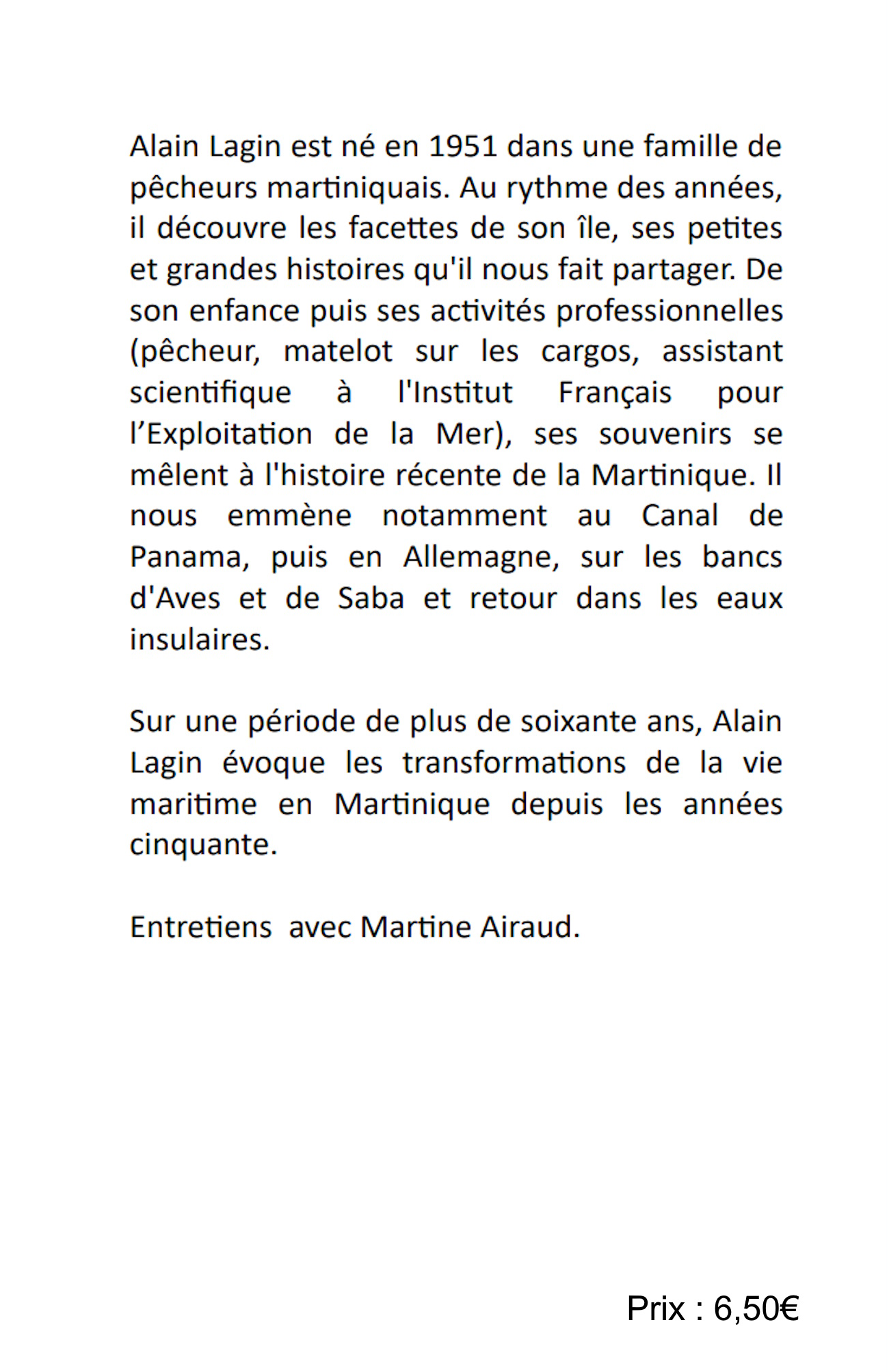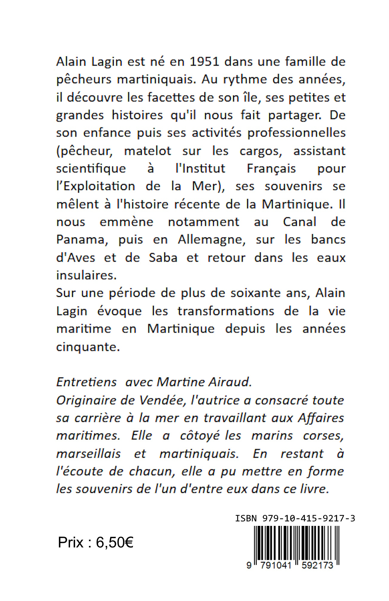 Alain Lagin est né en 1951 dans une famille de pêcheurs martiniquais. Au rythme des années, il découvre les facettes de son île, ses petites et grandes histoires qu'il nous fait partager. De son enfance puis ses activités professionnelles (pêcheur, matelot sur les cargos, assistant scientifique à l'Institut Français pour l’Exploitation de la Mer), ses souvenirs se mêlent à l'histoire récente de la Martinique. Il nous emmène notamment au Canal de Panama, puis en Allemagne, sur les bancs d'Aves et de Saba et retour dans les eaux insulaires.