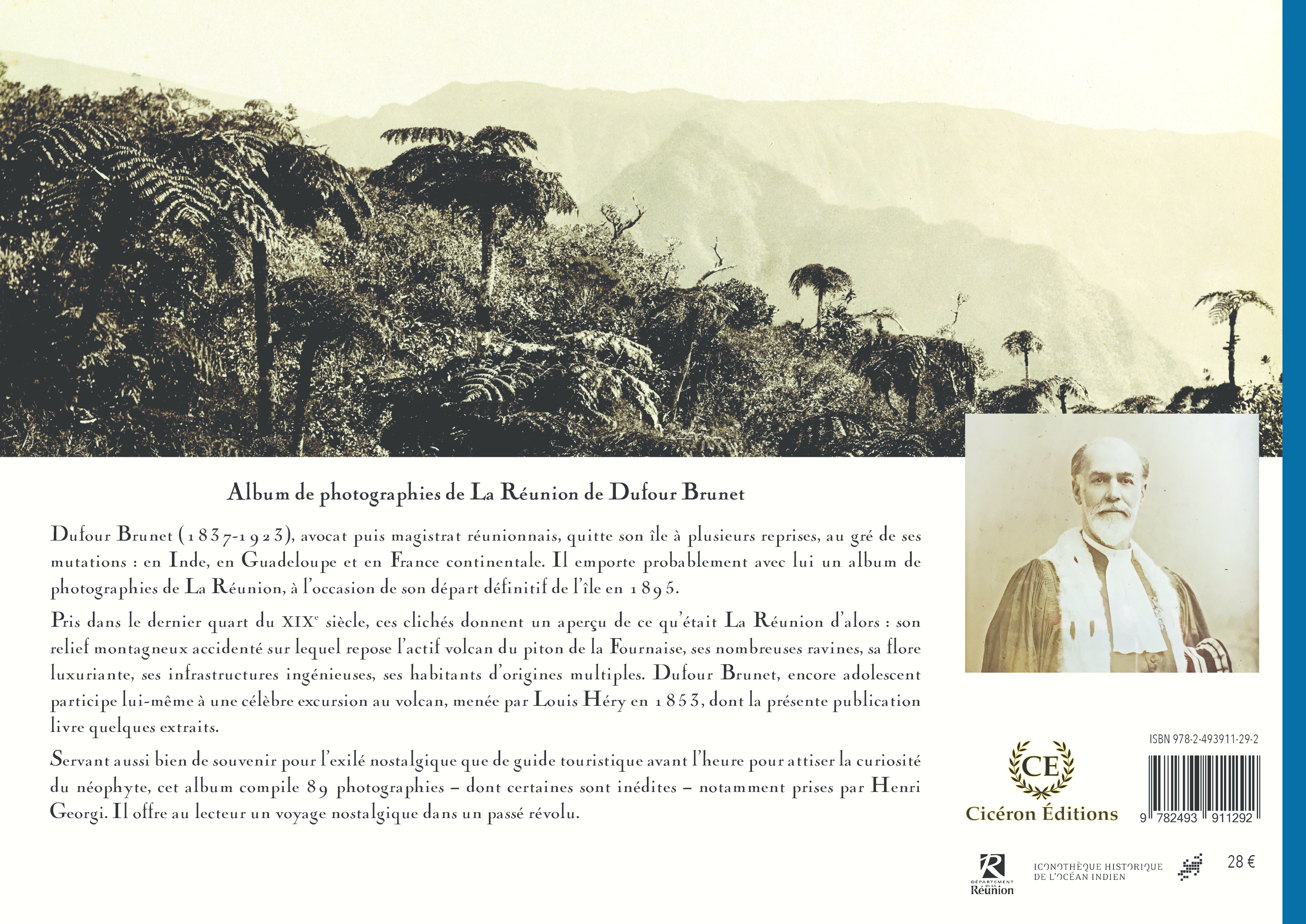 Dufour Brunet (1837-1923) avocat et magistrat réunionnais a quitté son île à plusieurs reprises au gré de ses mutations: en Inde, en Guadeloupe et en France continentale. Lors de son départ définitif en 1895, il emporte probablement un album de photographies de son île natale.