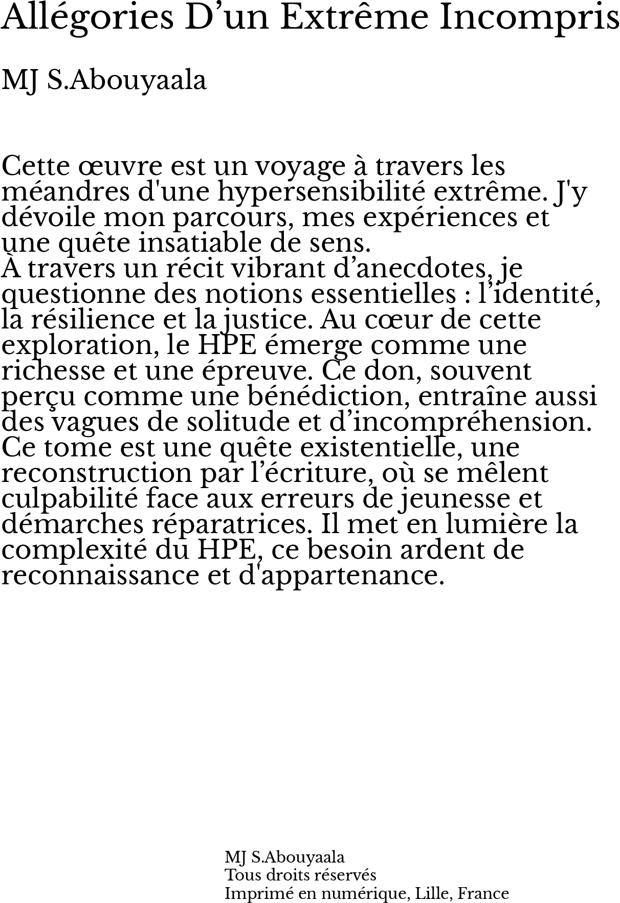 Cette œuvre est un voyage à travers les méandres d'une hypersensibilité extrême. J'y dévoile mon parcours, mes expériences et une quête insatiable de sens.