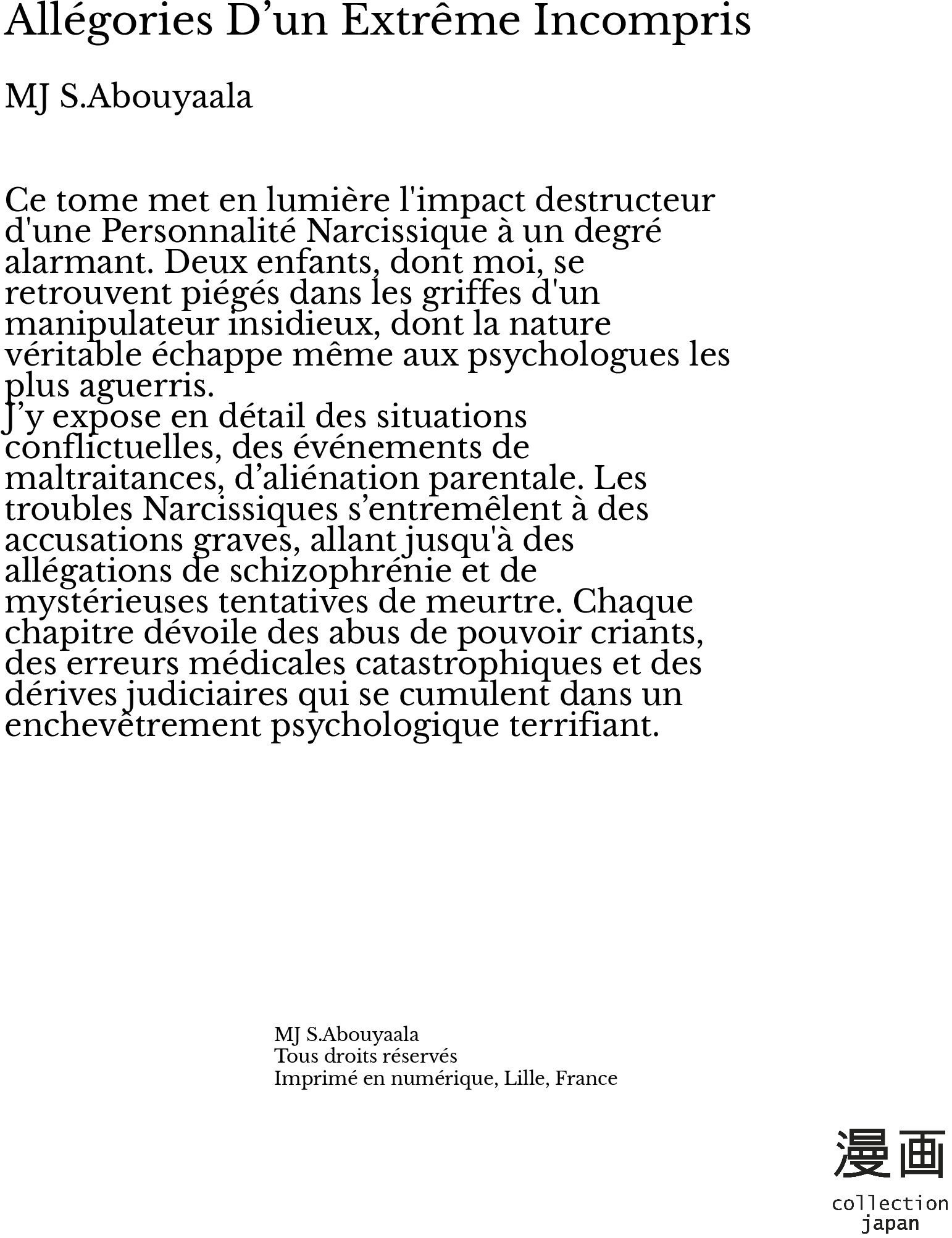 J’y expose en détail des situations conflictuelles, des événements de maltraitances, d’aliénation parentale. Les troubles Narcissiques s’entremêlent à des accusations graves, allant jusqu'à des allégations de schizophrénie et de mystérieuses tentatives de meurtre. Chaque chapitre dévoile des abus de pouvoir criants, des erreurs médicales catastrophiques et des dérives judiciaires qui se cumulent dans un enchevêtrement psychologique terrifiant.