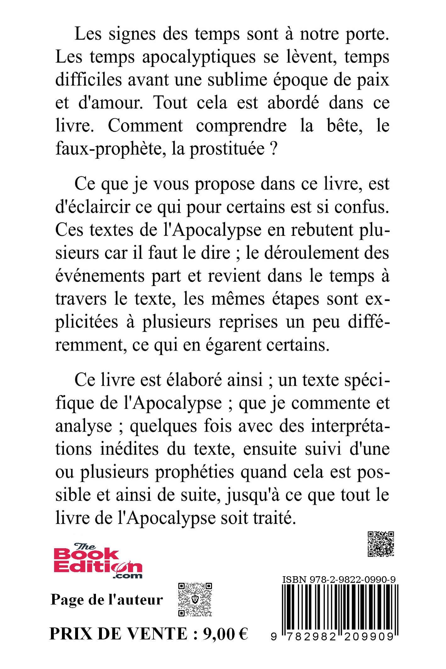 Les signes des temps sont à notre porte. Les temps apocalyptiques se lèvent, temps difficiles avant une sublime époque de paix et d'amour. Tout cela est abordé dans ce livre. Comment comprendre la bête, le faux-prophète, la prostituée ?