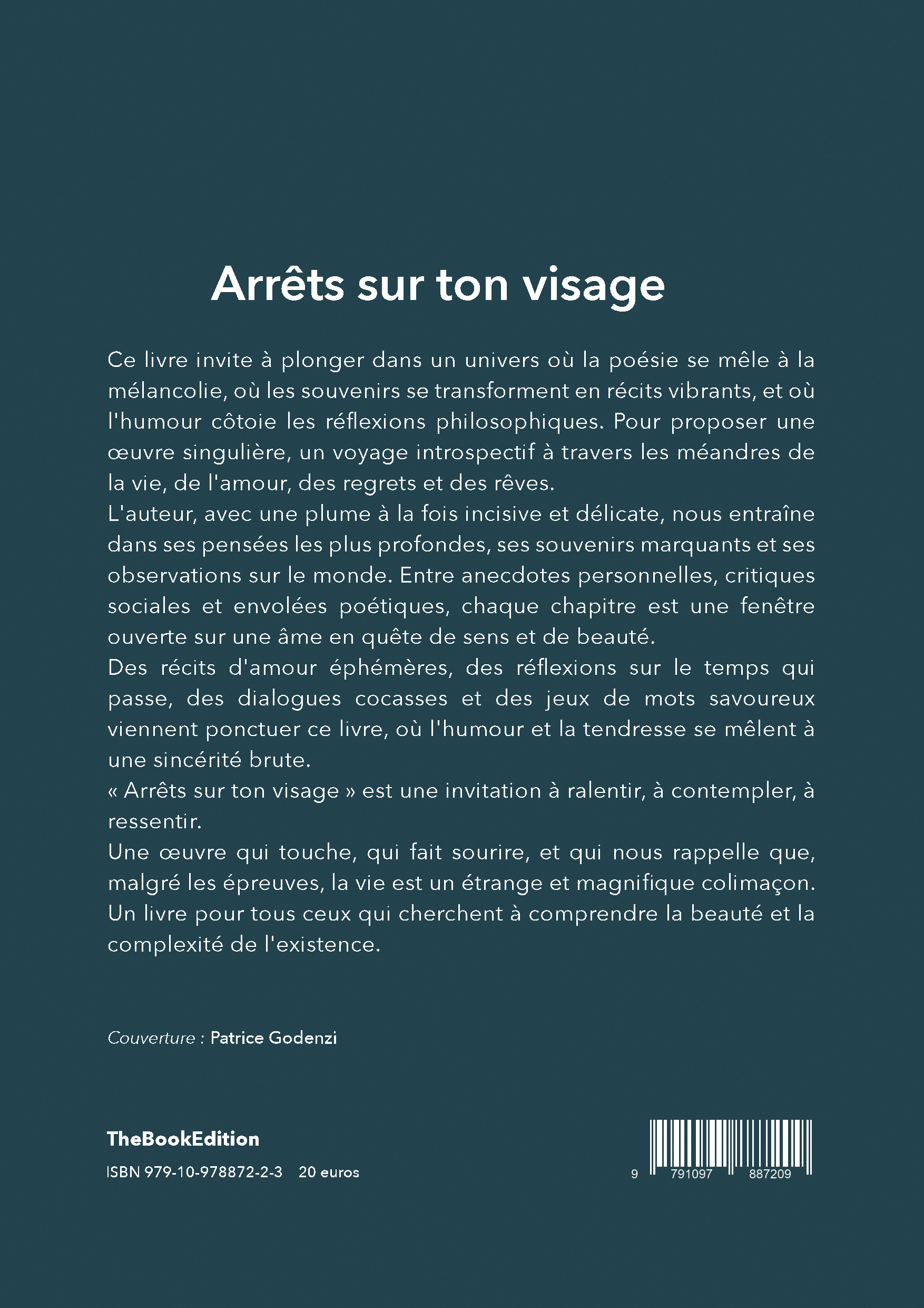 Ce livre invite à plonger dans un univers où la poésie se mêle à la mélancolie, où les souvenirs se transforment en récits vibrants, et où l'humour côtoie les réflexions philosophiques. Pour proposer une œuvre singulière, un voyage introspectif à travers les méandres de la vie, de l'amour, des regrets et des rêves.
