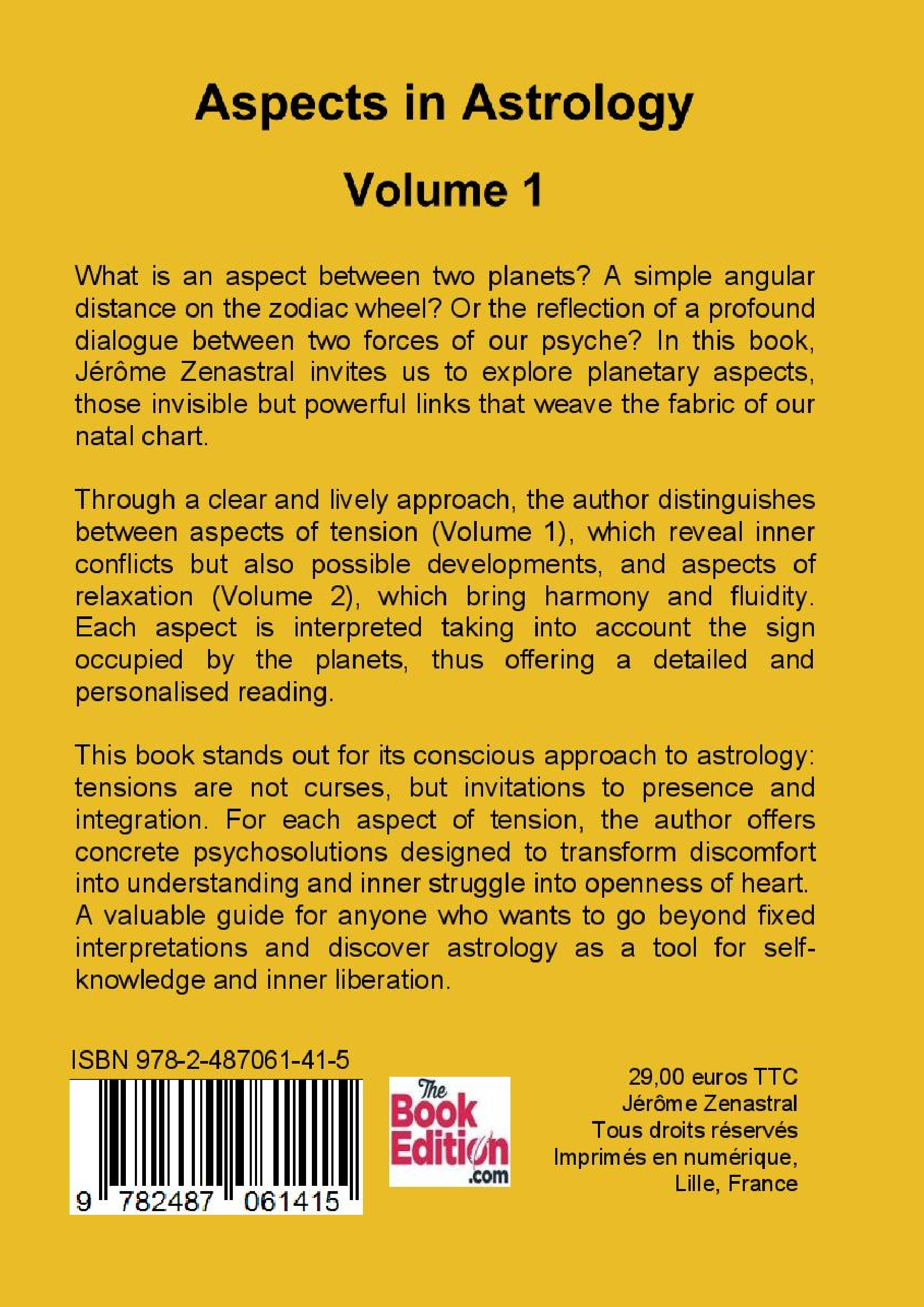 In this book, Jérôme Zenastral invites us to explore planetary aspects. Through a clear and lively approach, the author distinguishes between aspects of tension (Volume 1), which reveal inner conflicts but also possible developments, and aspects of relaxation (Volume 2), which bring harmony and fluidity. Each aspect is interpreted taking into account the sign occupied by the planets, thus offering a detailed and personalised reading. For each aspect, the author proposes concrete psychosolutions designed to transform discomfort into understanding.