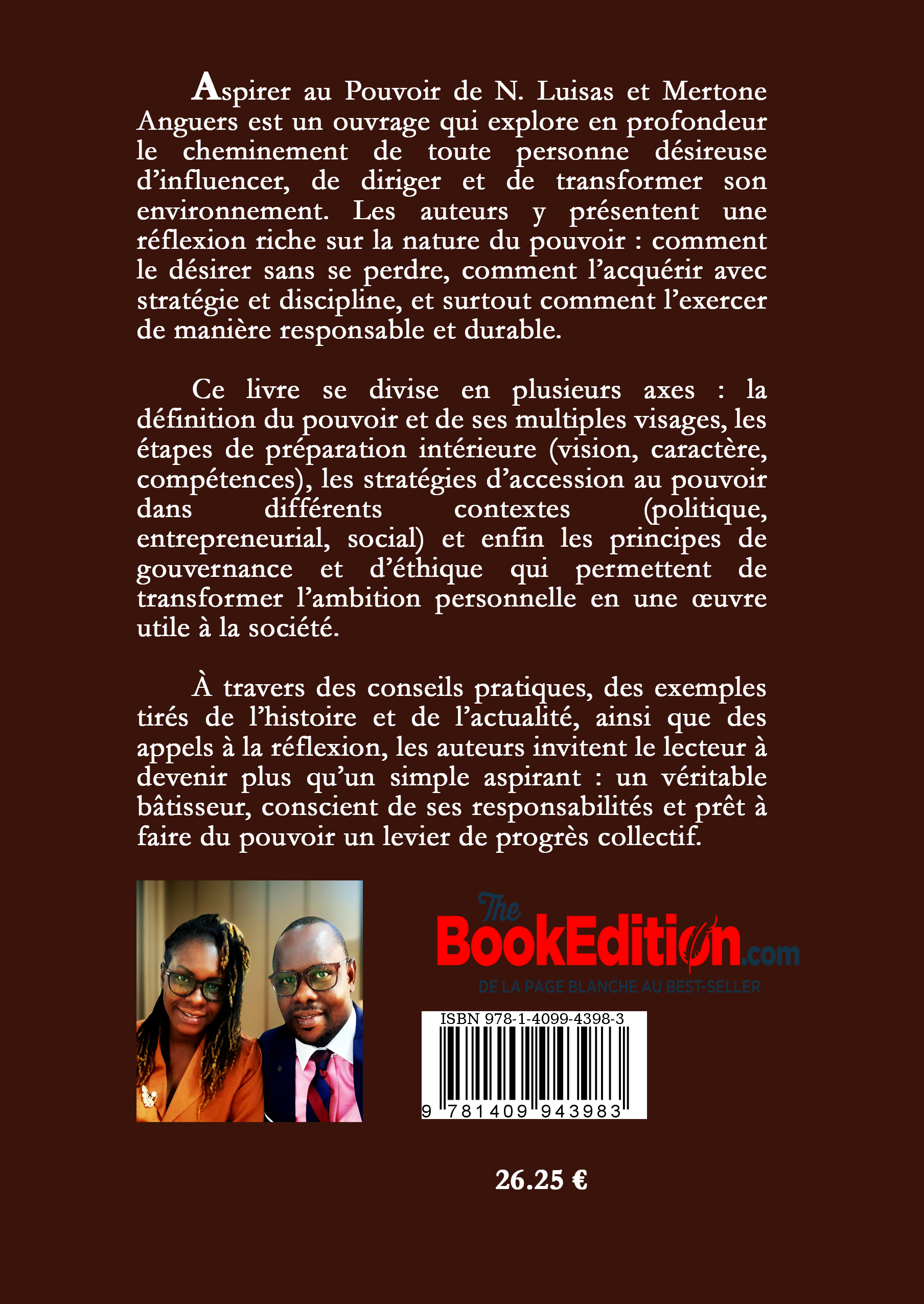 Aspirer au Pouvoir de N. Luisas et Mertone Anguers est un ouvrage qui explore en profondeur le cheminement de toute personne désireuse d’influencer, de diriger et de transformer son environnement. Les auteurs y présentent une réflexion riche sur la nature du pouvoir : comment le désirer sans se perdre, comment l’acquérir avec stratégie et discipline, et surtout comment l’exercer de manière responsable et durable.