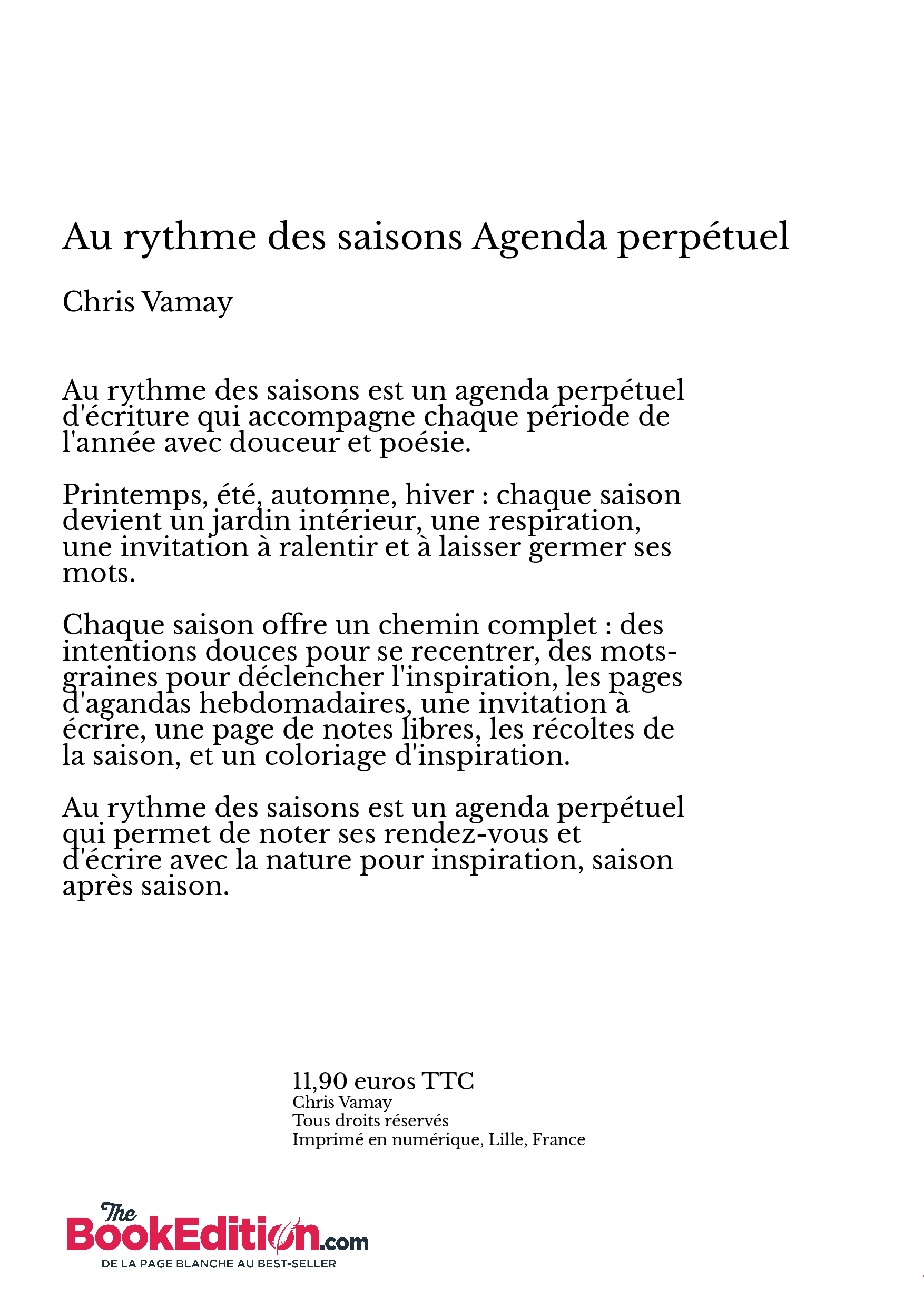 Chaque saison offre un chemin complet : des intentions douces pour se recentrer, des mots-graines pour déclencher l'inspiration, les pages d'agandas hebdomadaires, une invitation à écrire, une page de notes libres, les récoltes de la saison, et un coloriage d'inspiration.