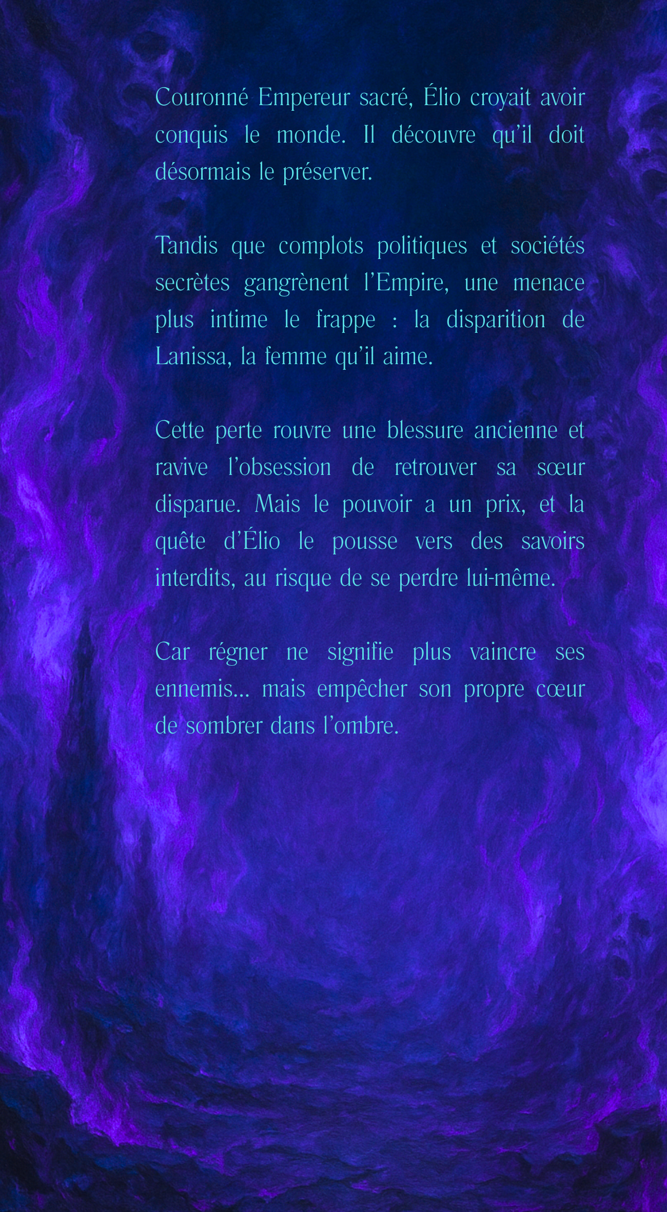 Couronné Empereur sacré, Élio croyait avoir conquis le monde. Il découvre qu’il doit désormais le préserver. Tandis que complots politiques et sociétés secrètes gangrènent l’Empire, une menace plus intime le frappe : la disparition de Lanissa, la femme qu’il aime. Cette perte rouvre une blessure ancienne et ravive l’obsession de retrouver sa sœur disparue. Mais le pouvoir a un prix, et la quête d’Élio le pousse vers des savoirs interdits, au risque de se perdre lui-même. Car régner ne signifie plus vaincre ses ennemis… mais empêcher son propre cœur de sombrer dans l’ombre.