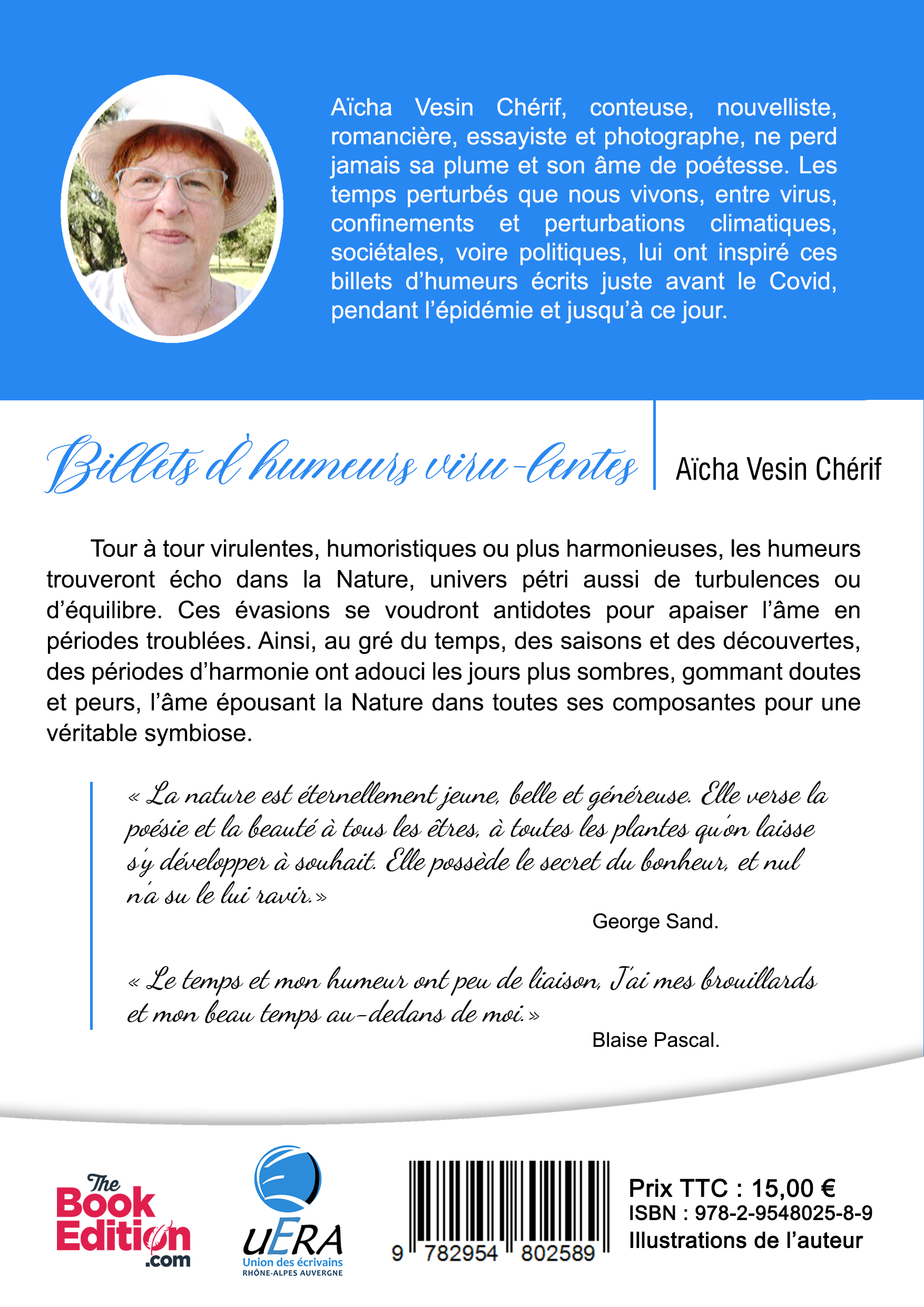 Tour à tour virulentes, humoristiques ou plus sereines, ces humeurs trouveront écho dans la Nature, univers pétri aussi de turbulences et d’équilibre. Les premiers poèmes ont été écrits juste avant le COVID et jusqu’à l’été 2022. Les périodes de confinements et déconfinements se sont révélées particulièrement difficiles à vivre pour beaucoup et génératrices de turbulences, visages masqués gommant nos expressions et perturbant nos certitudes. Homme et Nature: indissociables ! Puis, vous vous évaderez dans la nature, remède incontournable pour apaiser l'âme en périodes troublées. Vous terminerez par un envol vers des horizons sereins. Au fil des pages, vous croiserez poètes et chanteurs et les illustrations de l'auteur.