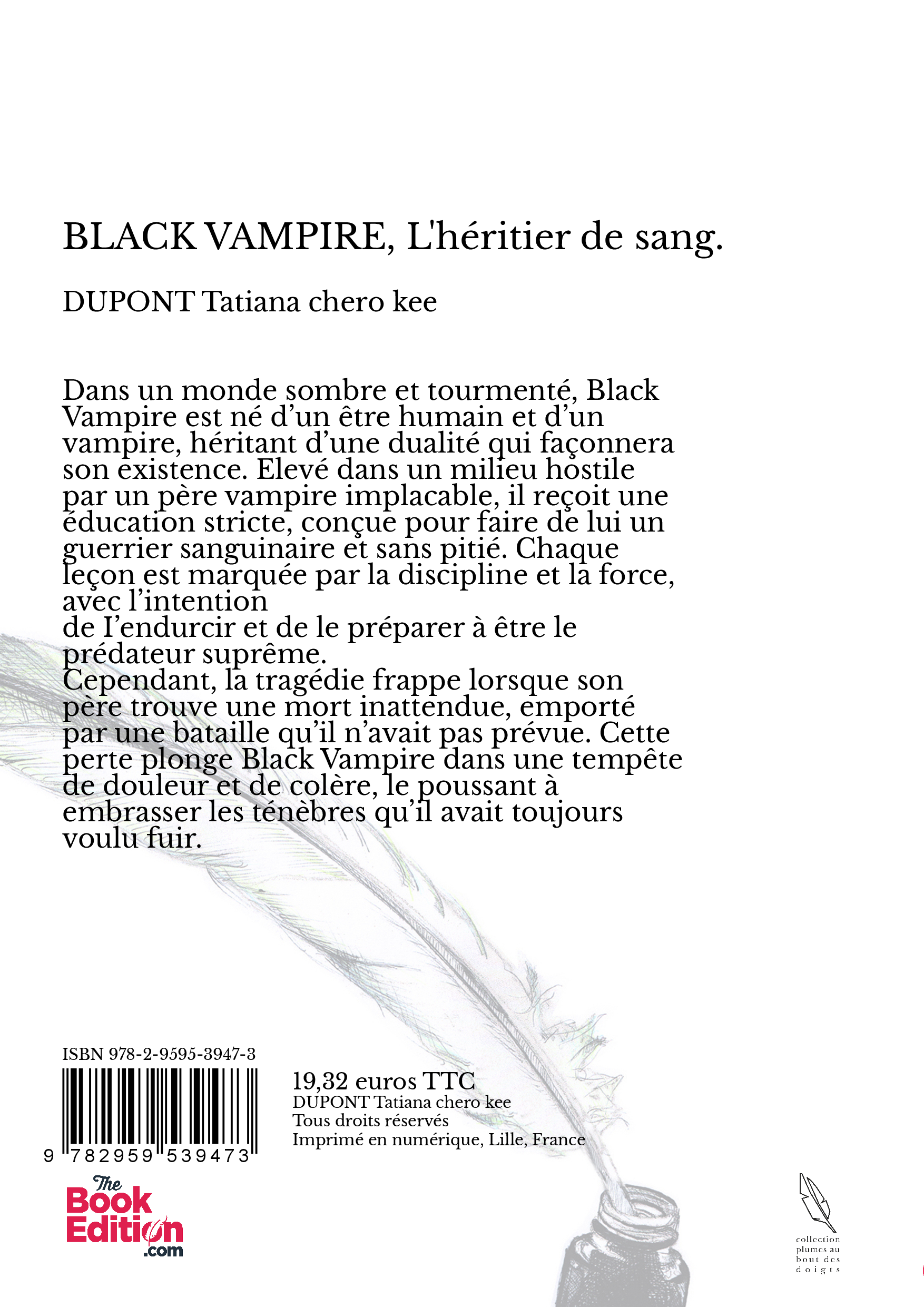Dans un monde sombre et tourmenté, Black Vampire est né d l un être humain et d’un vampire, héritant d l une dualité qui façonnera son existence. Elevé dans un milieu hostile par un père vampire implacable, il reçoit une éducation stricte, conçue pour faire de lui un guerrier sanguinaire et sans pitié. Chaque leçon est marquée par la discipline et la force, avec l'intention de l'endurcir et de le préparer à être le prédateur suprême. Cependant, la tragédie frappe lorsque son père trouve une mort inattendue, emporté par une bataille qu’il n’avait pas prévue. Cette perte plonge Black Vampire dans une tempête de douleur et de colère, le poussant à embrasser les ténèbres qu’il avait toujours voulu fuir.