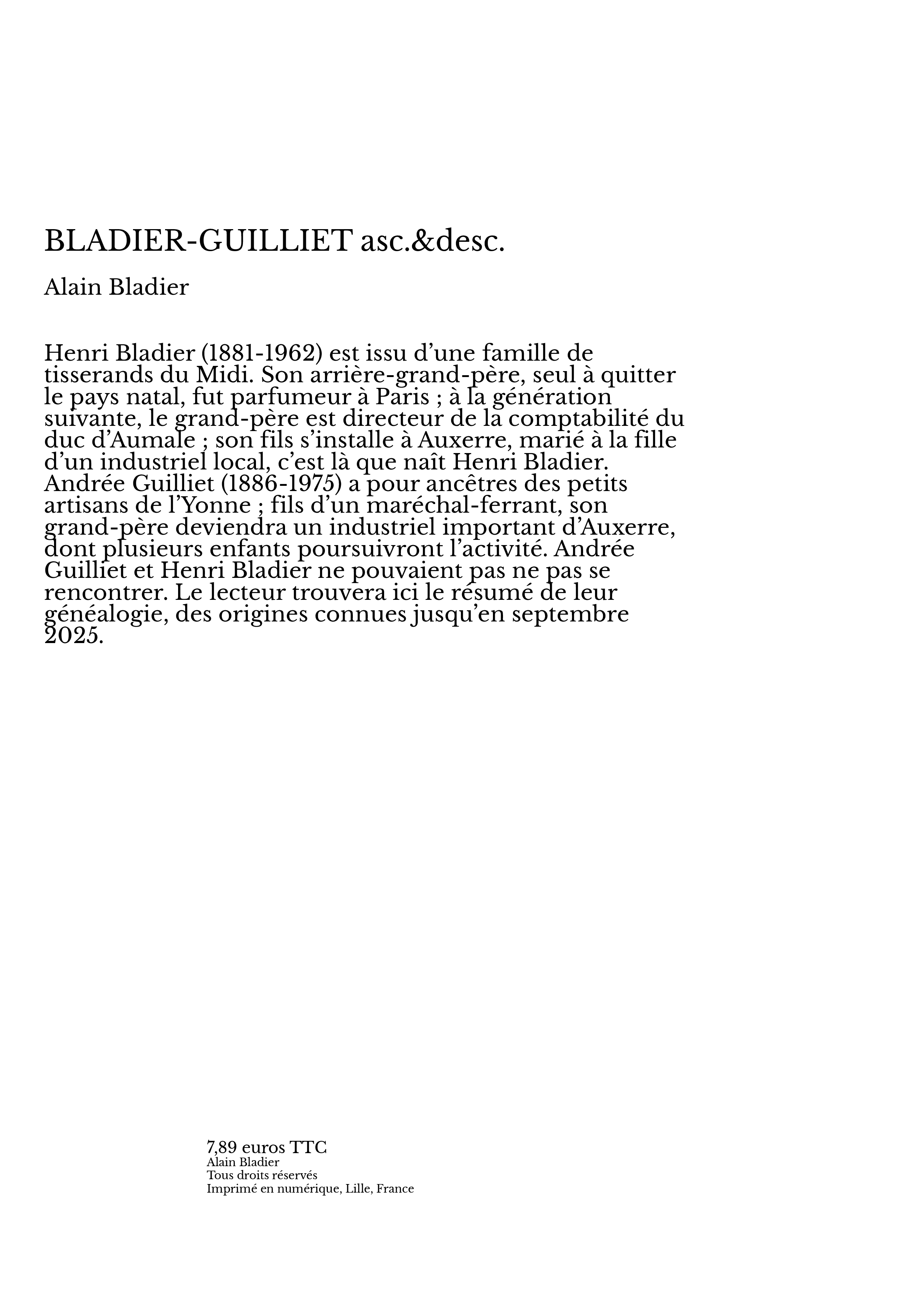 Henri Bladier (1881-1962) est issu d’une famille de tisserands du Midi. Son arrière-grand-père, seul à quitter le pays natal, fut parfumeur à Paris ; à la génération suivante, le grand-père est directeur de la comptabilité du duc d’Aumale ; son fils s’installe à Auxerre, marié à la fille d’un industriel local, c’est là que naît Henri Bladier. Andrée Guilliet (1886-1975) a pour ancêtres des petits artisans de l’Yonne ; son arrière-grand-père, d’abord ébéniste, devint un industriel important d’Auxerre, dont les fils poursuivirent l’activité. Andrée Guilliet et Henri Bladier ne pouvaient pas ne pas se rencontrer. Le lecteur trouvera ici le résumé de leur généalogie, des origines connues jusqu’en septembre 2025.