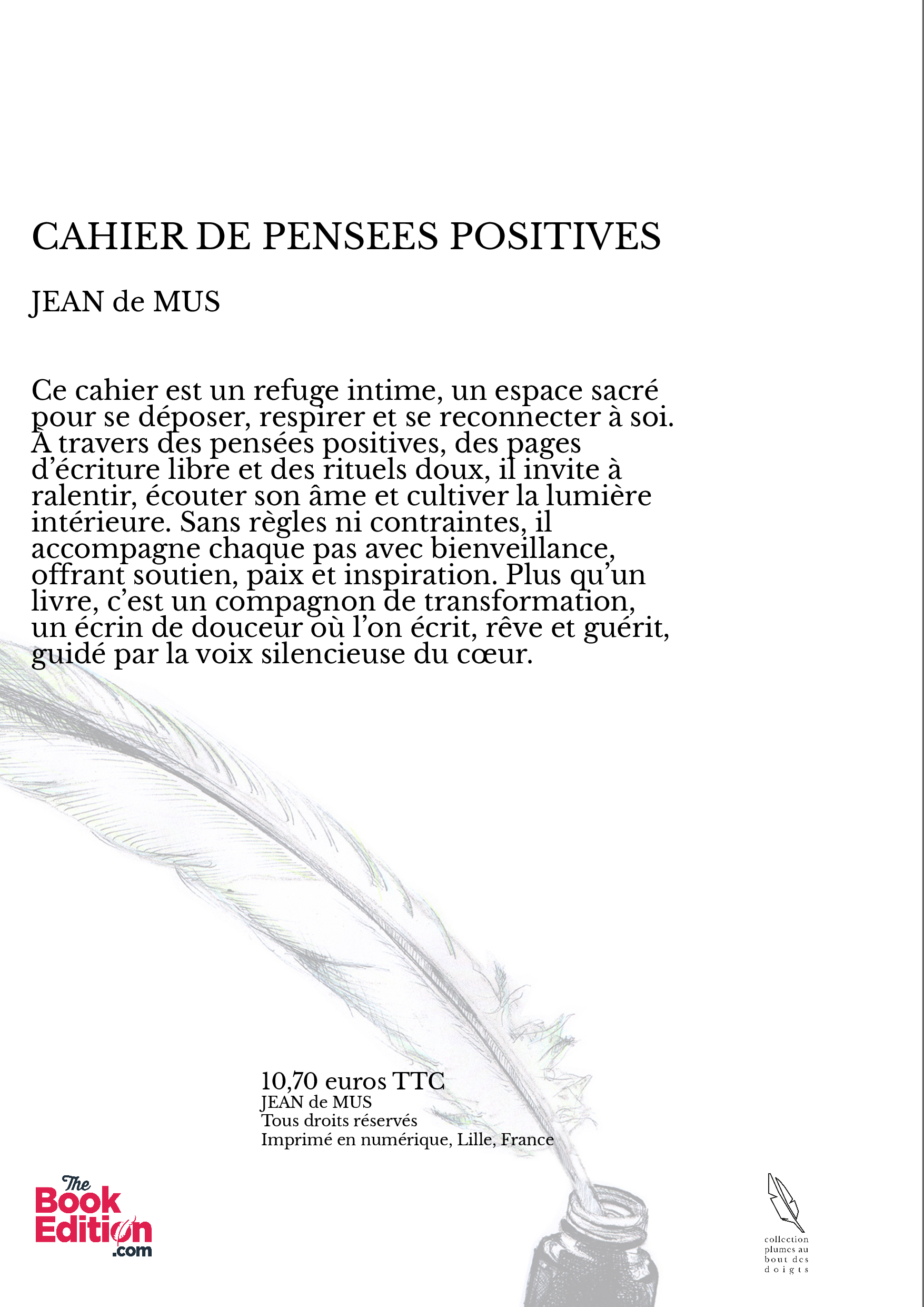 Dans cet exquis petit «Cahier de Pensées positives» l’auteur nous confie de magnifiques pensées profondément inspirantes puis nous offre un espace sacré pour y noter nos ressentis et ainsi redécouvrir l’acte d’écriture comme un refuge et un outil de transformation.