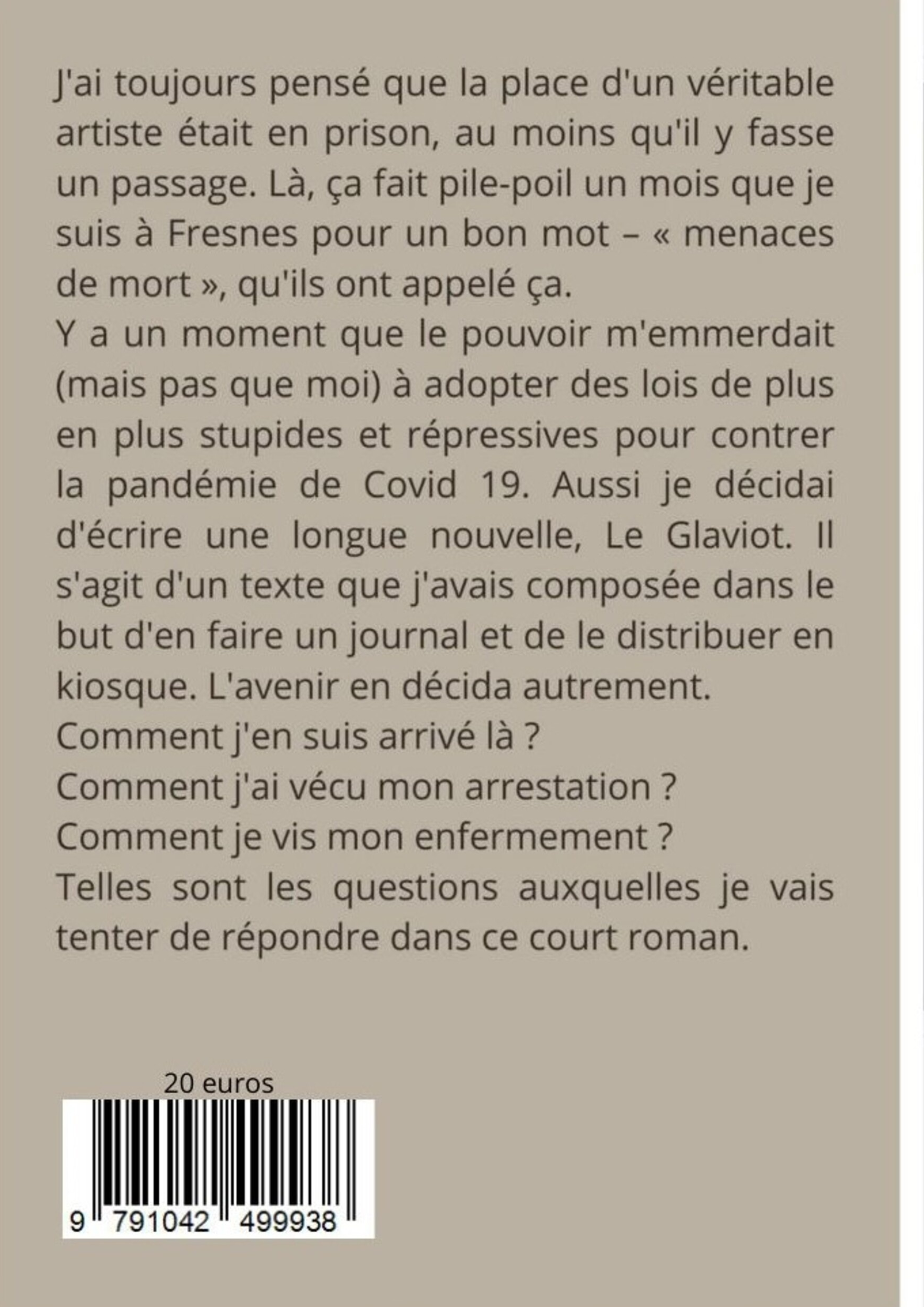 Y a un moment que le pouvoir m'emmerdait (mais pas que moi) à adopter des lois de plus en plus stupides et répressives pour contrer la pandémie de Covid 19. Aussi je décidai d'écrire une longue nouvelle, Le Glaviot. Il s'agit d'un texte que j'avais composée dans le but d'en faire un journal et de le distribuer en kiosque. L'avenir en décida autrement.