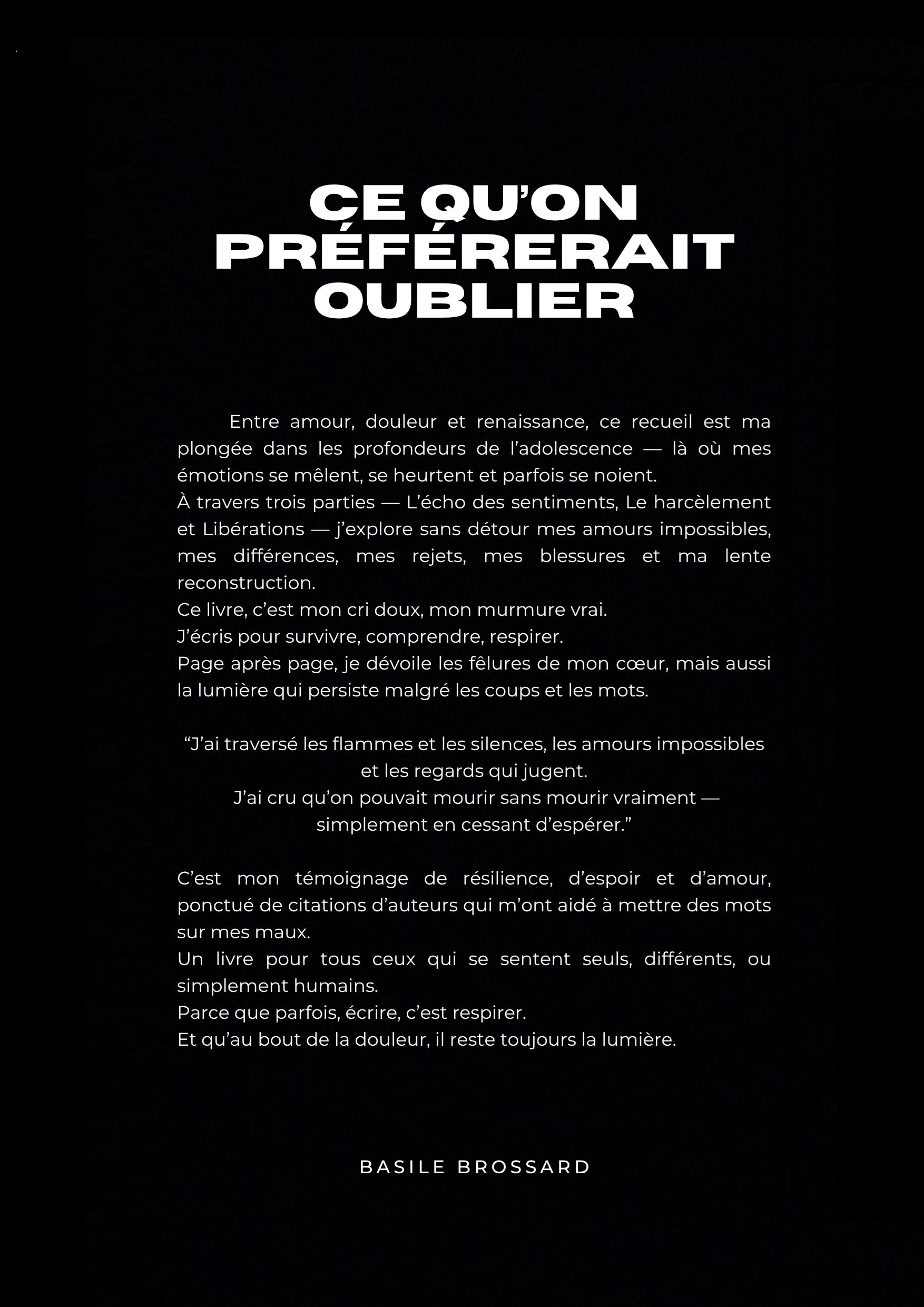 Entre amour, douleur et renaissance, ce recueil raconte ma plongée dans l’adolescence et tout ce que j’y ai vécu : les sentiments qui débordent, le harcèlement, les blessures et la reconstruction.