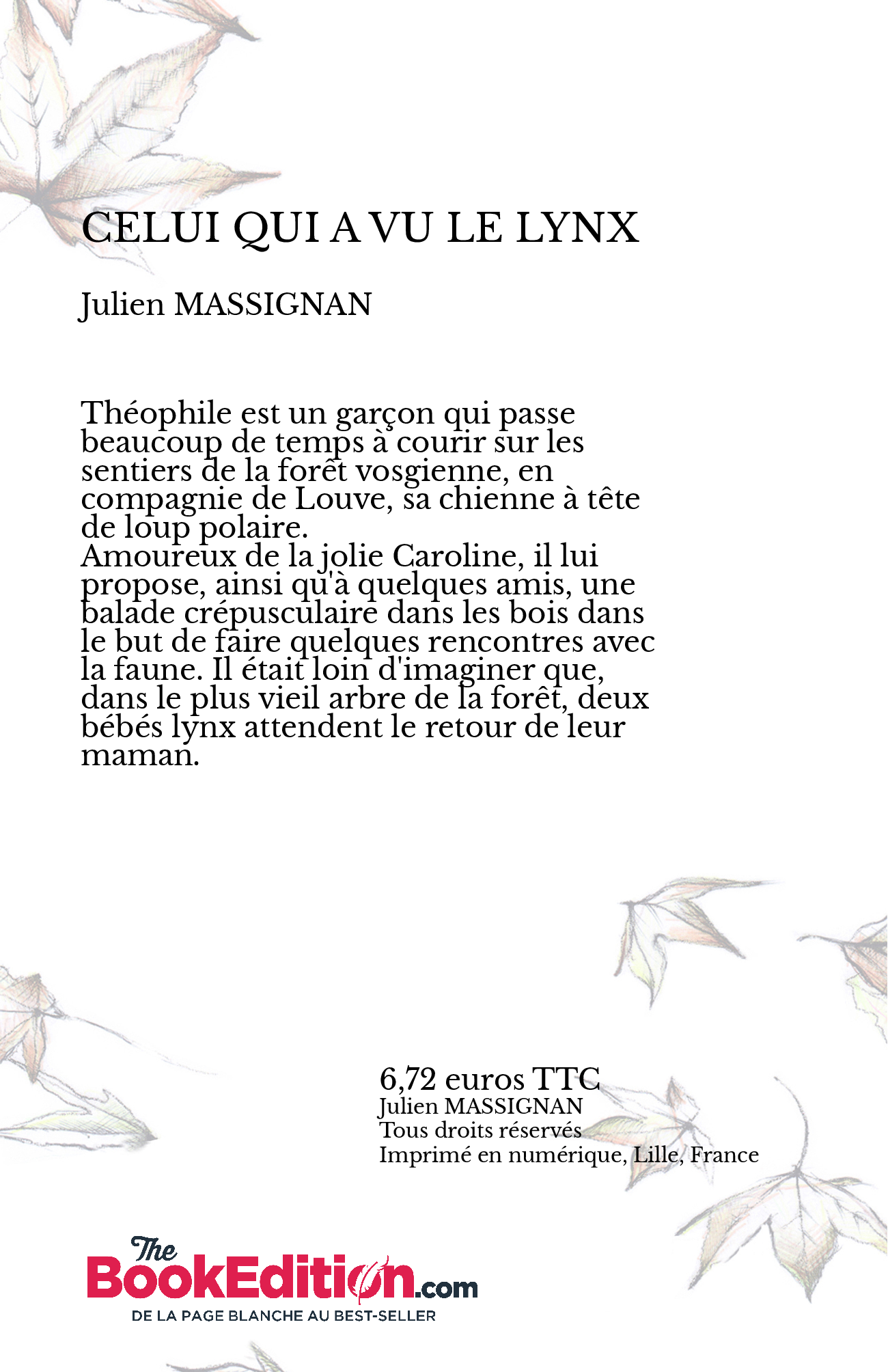 Amoureux de la jolie Caroline, il lui propose, ainsi qu'à quelques amis, une balade crépusculaire dans les bois dans le but de faire quelques rencontres avec la faune. Il était loin d'imaginer que, dans le plus vieil arbre de la forêt, deux bébés lynx attendent le retour de leur maman.