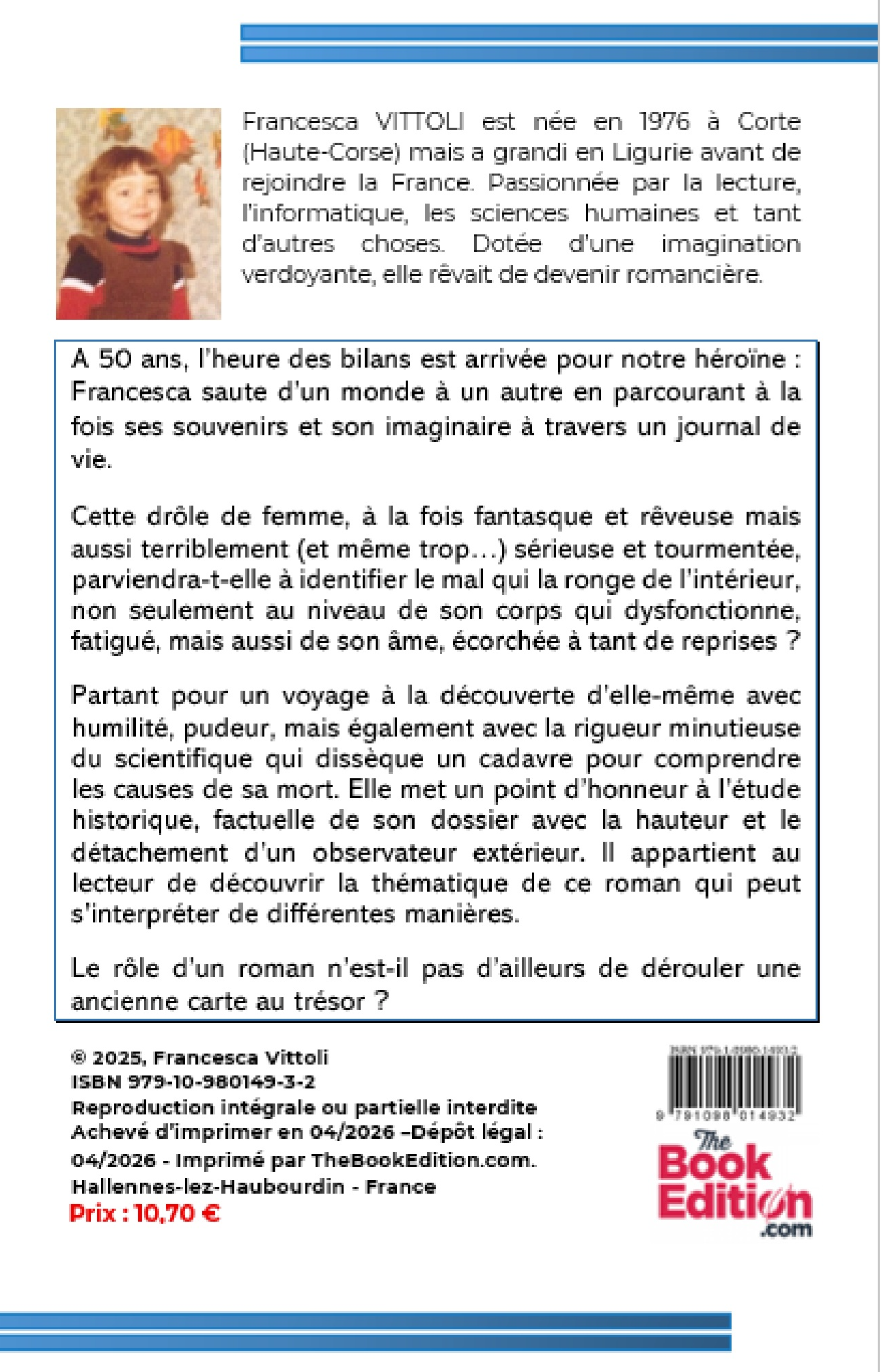 Francesca saute d’un monde à un autre en parcourant à la fois ses souvenirs et son imaginaire. Cette drôle de femme, fantasque et rêveuse mais aussi terriblement sérieuse, parviendra-t-elle à identifier le mal qui la ronge de l’intérieur, non seulement au niveau de son corps qui dysfonctionne, mais aussi de son âme, écorchée à tant de reprises ? Partant pour un voyage à la découverte d’elle-même avec humilité, pudeur, et avec la rigueur minutieuse du scientifique qui dissèque un cadavre pour comprendre les causes de sa mort. Elle met un point d’honneur à l’étude historique, factuelle de son dossier avec le détachement d’un observateur extérieur. Le rôle d’un roman n’est-il pas de dérouler une ancienne carte au trésor ?