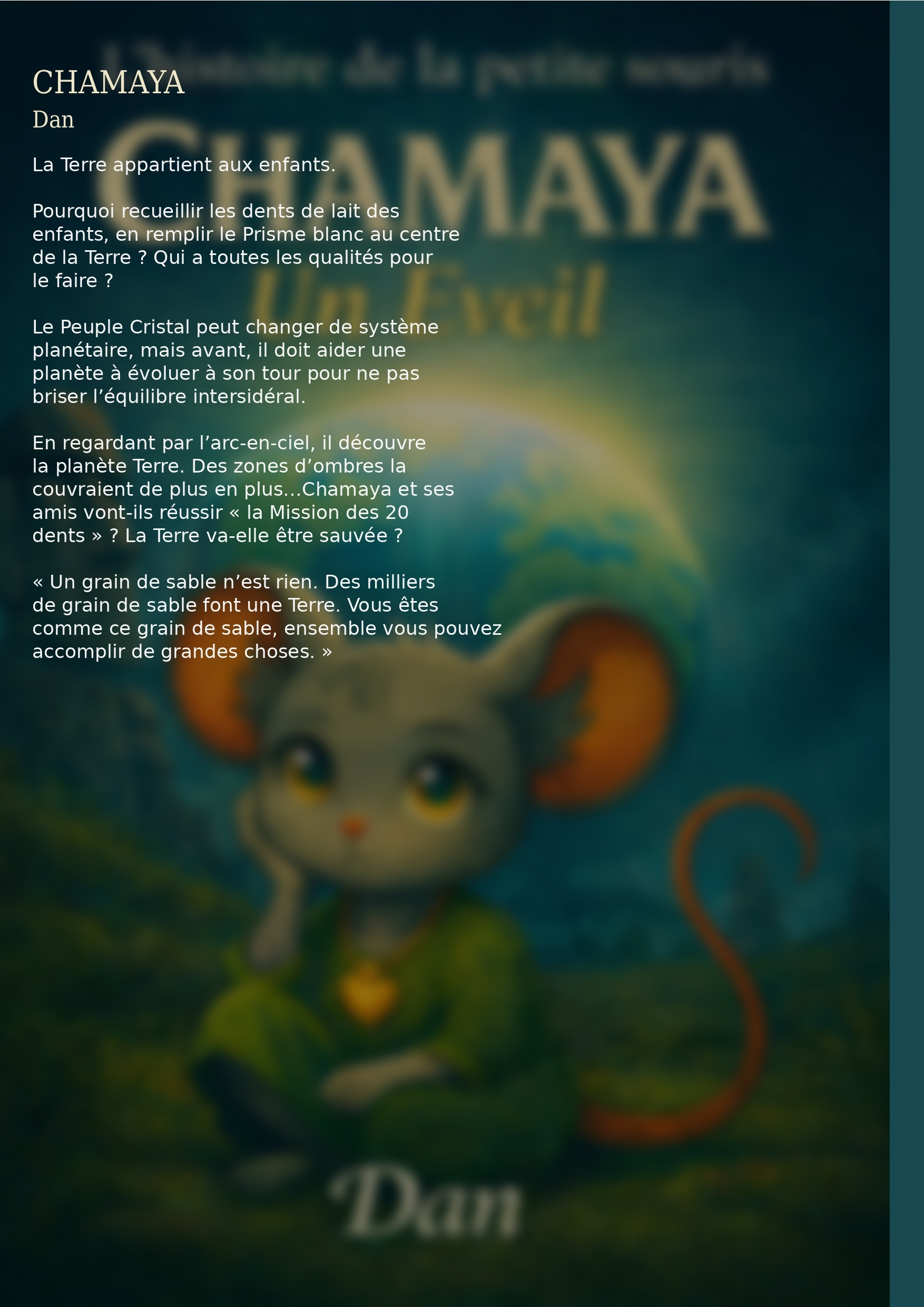 En regardant par l’arc-en-ciel, le Grand Initié découvre la planète Terre. Des zones d’ombres la couvraient de plus en plus…Chamaya et ses amis vont-ils réussir à sauver la Terre ? Un Eveil va -il se produire ?