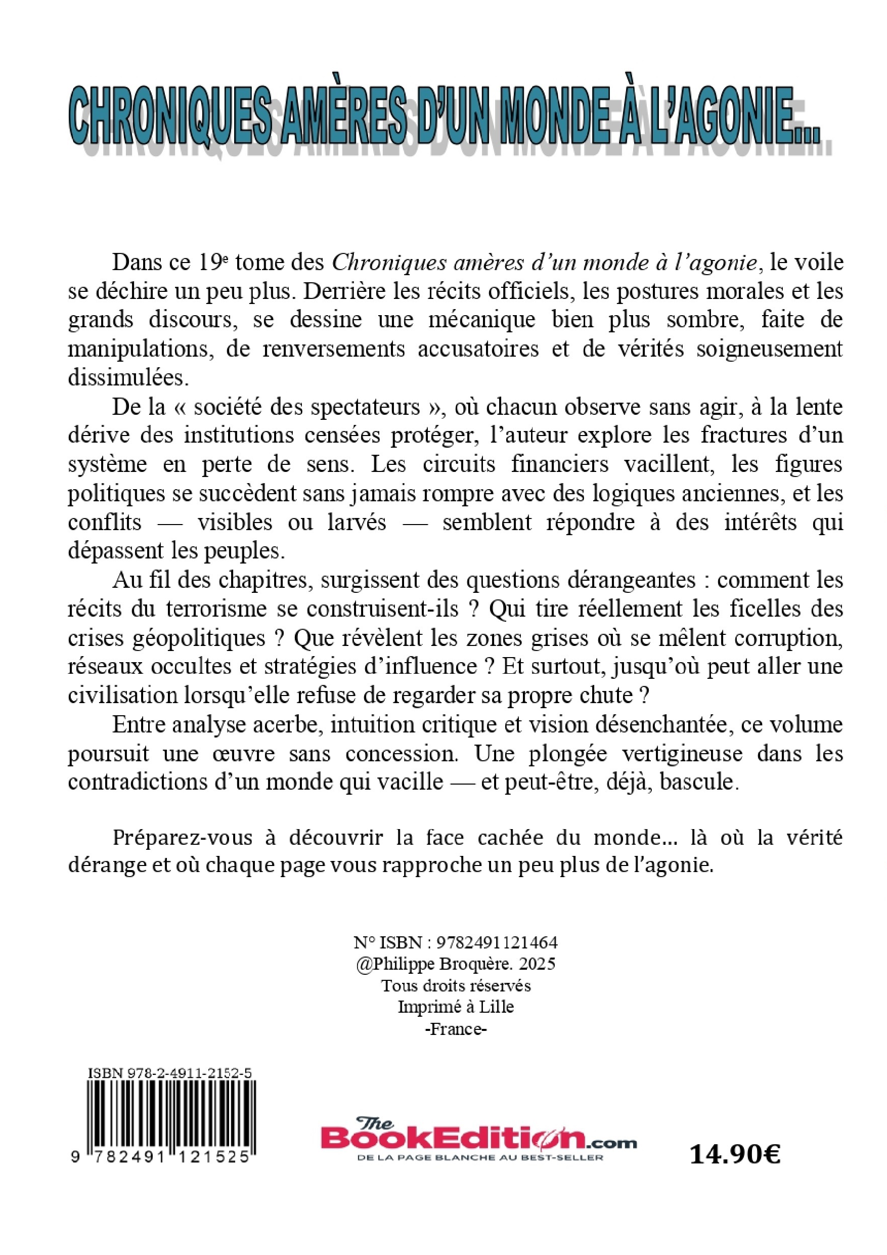 Dans ce 19ᵉ tome des Chroniques amères d’un monde à l’agonie, le voile se déchire un peu plus. Derrière les récits officiels, les postures morales et les grands discours, se dessine une mécanique bien plus sombre, faite de manipulations, de renversements accusatoires et de vérités soigneusement dissimulées. Au fil des chapitres, surgissent des questions dérangeantes : comment les récits du terrorisme se construisent-ils ? Qui tire réellement les ficelles des crises géopolitiques ? Que révèlent les zones grises où se mêlent corruption, réseaux occultes et stratégies d’influence ? Et surtout, jusqu’où peut aller une civilisation lorsqu’elle refuse de regarder sa propre chute ? Préparez-vous à découvrir la face cachée…