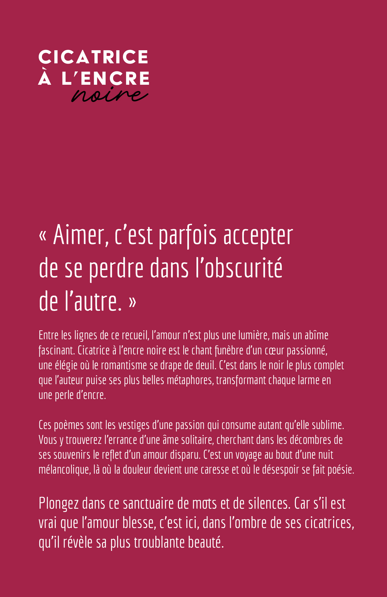 Entre les lignes de ce recueil, l’amour n’est plus une lumière, mais un abîme fascinant. Cicatrice à l’encre noire est le chant funèbre d’un cœur passionné, une élégie où le romantisme se drape de deuil. C’est dans le noir le plus complet que l’auteur puise ses plus belles métaphores, transformant chaque larme en une perle d'encre.