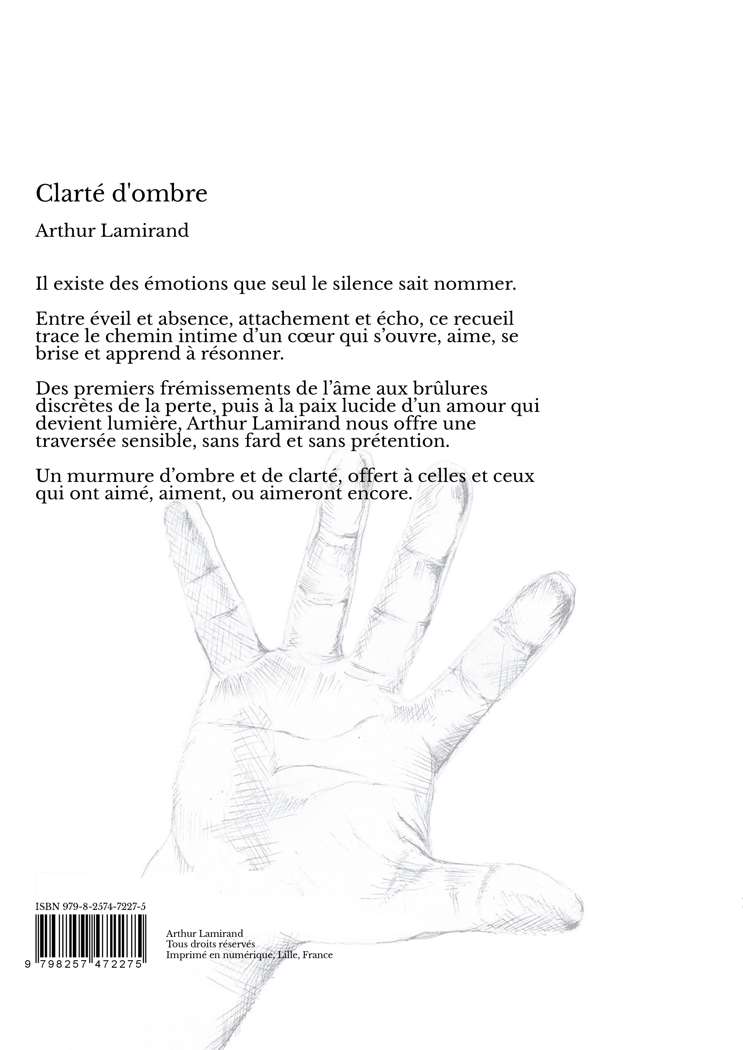 Des premiers frémissements de l’âme aux brûlures discrètes de la perte, puis à la paix lucide d’un amour qui devient lumière, Arthur Lamirand nous offre une traversée sensible, sans fard et sans prétention.
