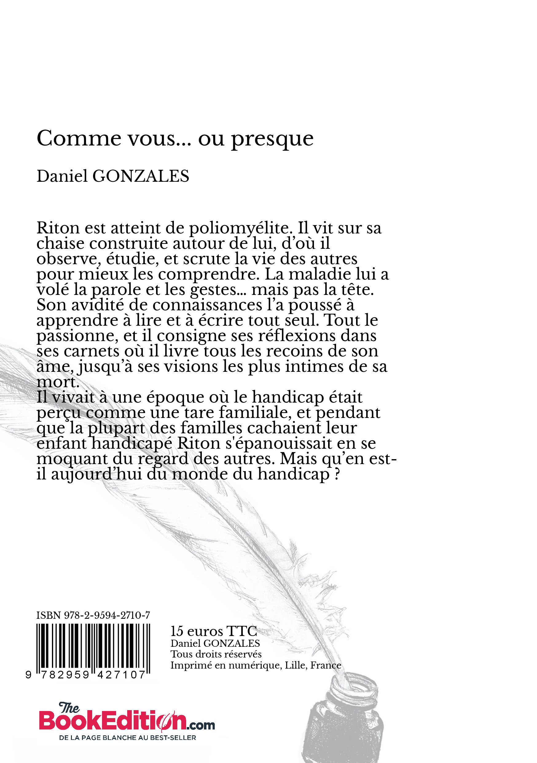 Riton est atteint de poliomyélite. Il vit sur sa chaise construite autour de lui, d’où il observe, étudie, et scrute la vie des autres pour mieux les comprendre. La maladie lui a volé la parole et les gestes… mais pas la tête. Son avidité de connaissances l’a poussé à apprendre à lire et à écrire tout seul. Tout le passionne, et il consigne ses réflexions dans ses carnets où il livre tous les recoins de son âme, jusqu’à ses visions les plus intimes de sa mort.