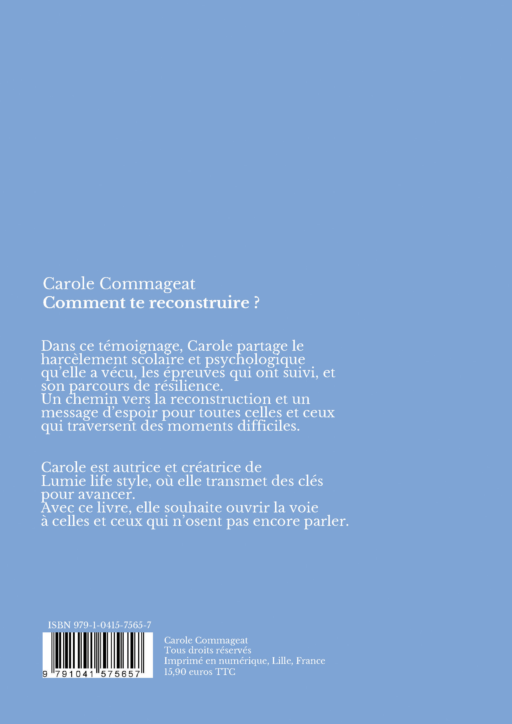 Ce livre m’a profondément touchée. À travers le récit de Carole, on comprend avec une grande justesse les conséquences du harcèlement scolaire : la douleur, les blessures invisibles, mais aussi le long chemin intérieur qu’il impose.