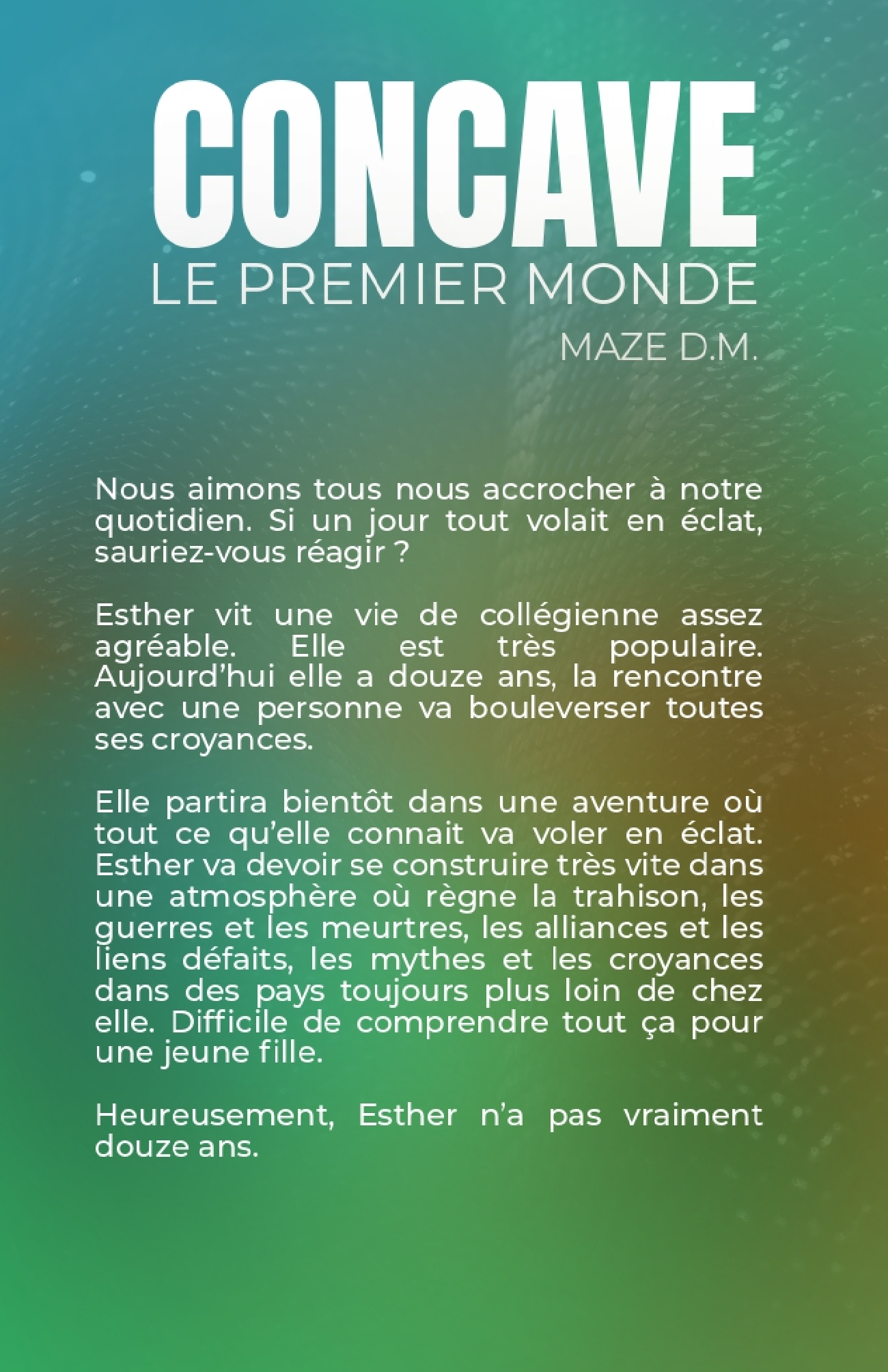Esther est une jeune fille de tout juste douze ans. Elle vie sur cette bonne vieille terre. Elle découvre lors de son anniversaire que quelque chose à changé autour et en elle. Esther va découvrir que c'est tout son univers qui va être bouleversé. Sa famille, son monde et toutes ses certitudes vont exploser. Elle a heureusement le caractère fougueux de sa mère biologique pour affronter toutes ces nouvelles informations. A douze ans ça fait beaucoup à ingurgiter, heureusement Esther n'a pas vraiment douze ans !