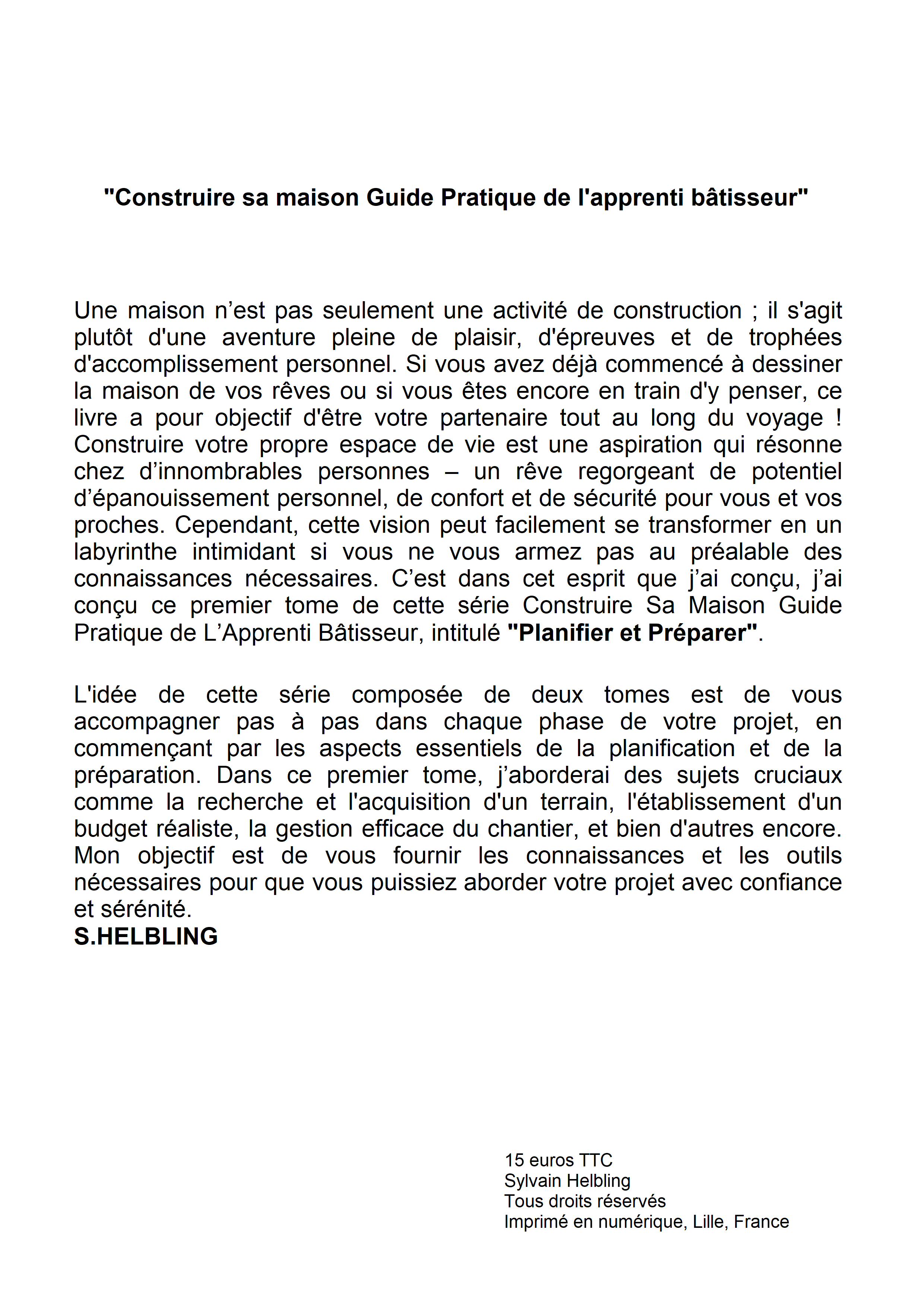 Une maison n’est pas seulement une activité de construction ; il s'agit plutôt d'une aventure pleine de plaisir.Si vous avez déjà commencé à dessiner la maison de vos rêves ou si vous êtes encore en train d'y penser, ce livre a pour objectif d'être votre partenaire tout au long du voyage ! Construire votre propre espace de vie est une aspiration qui résonne chez d’innombrables personnes .Cependant, cette vision peut facilement se transformer en un labyrinthe intimidant si vous ne vous armez pas au préalable des connaissances nécessaires. C’est dans cet esprit que j’ai conçu, j’ai conçu ce premier tome de cette série Construire Sa Maison Guide Pratique de L’Apprenti Bâtisseur, intitulé "Planifier et Préparer"