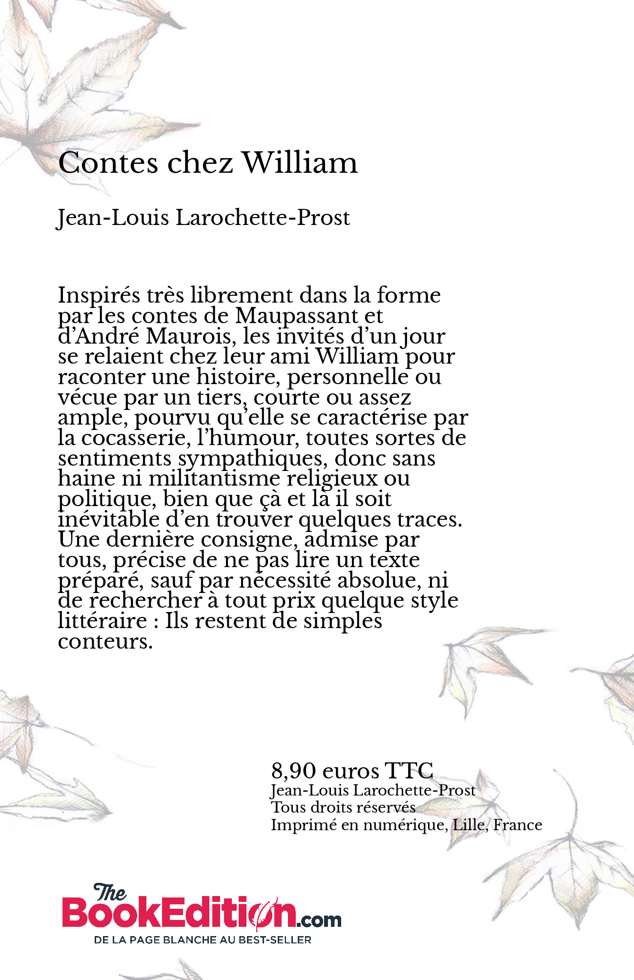 Inspirés très librement dans la forme par les contes de Maupassant et d’André Maurois, les invités d’un jour se relaient chez leur amis William pour raconter une histoire, personnelle ou vécue par un tiers, courte ou assez ample, pourvu qu’elle se caractérise par la cocasserie, l’humour, toutes sortes de sentiments sympathiques, donc sans haine ni militantisme religieux ou politique, bien que çà et là il soit inévitable d’en trouver quelques traces. Une dernière consigne, admise par tous, précise de ne pas lire un texte préparé, sauf par nécessité absolue, ni de rechercher à tout prix quelque style littéraire : Ils restent de simples conteurs.