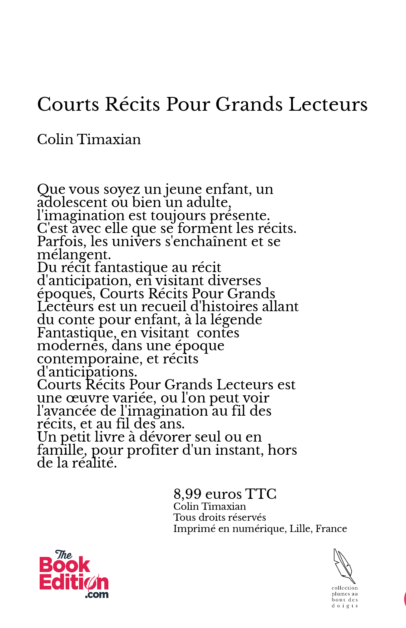 Du récit fantastique au récit d'anticipation, en visitant diverses époques, Courts Récits Pour Grands Lecteurs est un recueil d'histoires allant du conte pour enfant, à la légende Fantastique, en visitant contes modernes, dans une époque contemporaine, et récits d'anticipations.