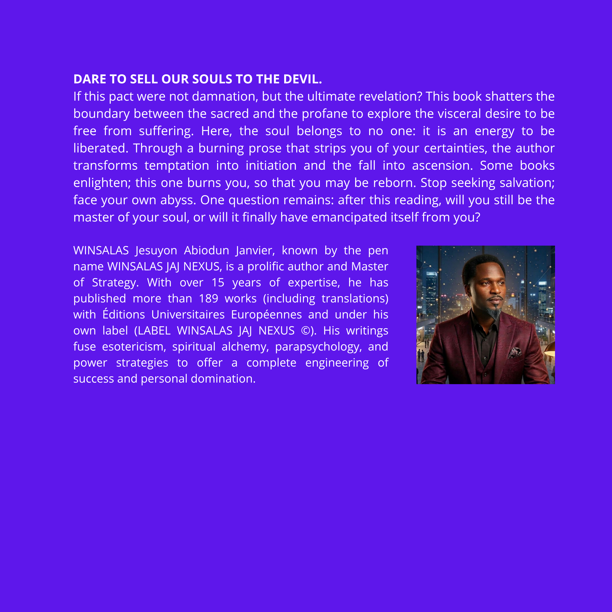If this pact were not damnation, but the ultimate revelation? This book shatters the boundary between the sacred and the profane to explore the visceral desire to be free from suffering. Here, the soul belongs to no one: it is an energy to be liberated. Through a burning prose that strips you of your certainties, the author transforms temptation into initiation and the fall into ascension. Some books enlighten; this one burns you, so that you may be reborn. Stop seeking salvation; face your own abyss. One question remains: after this reading, will you still be the master of your soul, or will it finally have emancipated itself from you?