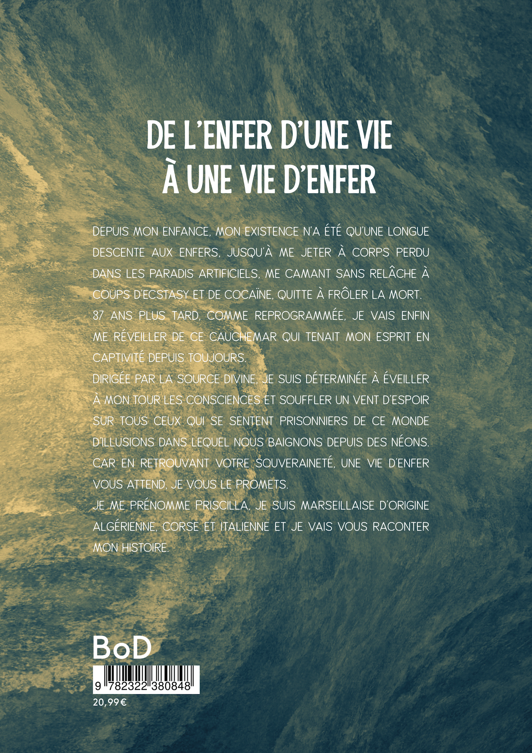 Depuis mon enfance, mon existence n'a été qu'une longue descente aux enfers, jusqu'à me jeter à corps perdu dans les paradis artificiels, me camant sans relâche à coups d'ecstasy et de cocaïne, quitte à frôler la mort. 37 ans plus tard, je vais enfin me réveiller de ce cauchemar qui tenait mon esprit en captivité depuis toujours. Dirigée par la source divine, je suis déterminée à éveiller à mon tour les consciences et souffler un vent d'espoir sur tous ceux qui se sentent prisonniers de ce monde d'illusions dans lequel nous baignons depuis des éons. Je me prénomme Priscilla, je suis marseillaise d'origine algérienne, corse et italienne et je vais vous raconter mon histoire.