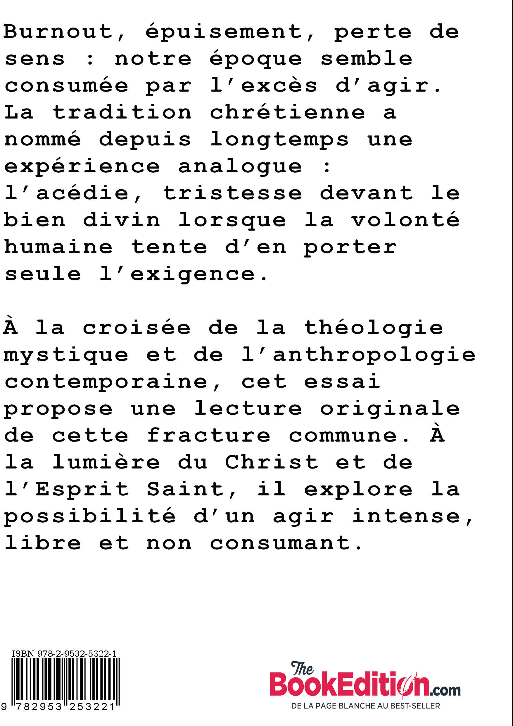 Burnout, épuisement, perte de sens : notre époque semble consumée par l’excès d’agir. La tradition chrétienne nomme depuis longtemps une expérience analogue : l’acédie, tristesse devant le bien divin lorsque la volonté humaine tente d’en porter seule l’exigence. Cet essai croise théologie mystique et anthropologie contemporaine pour montrer que burnout et acédie révèlent une même fracture : un agir auto-fondé. À la lumière du Christ et de l’Esprit Saint, il propose une transfiguration du principe d’action : agir sans se consumer.