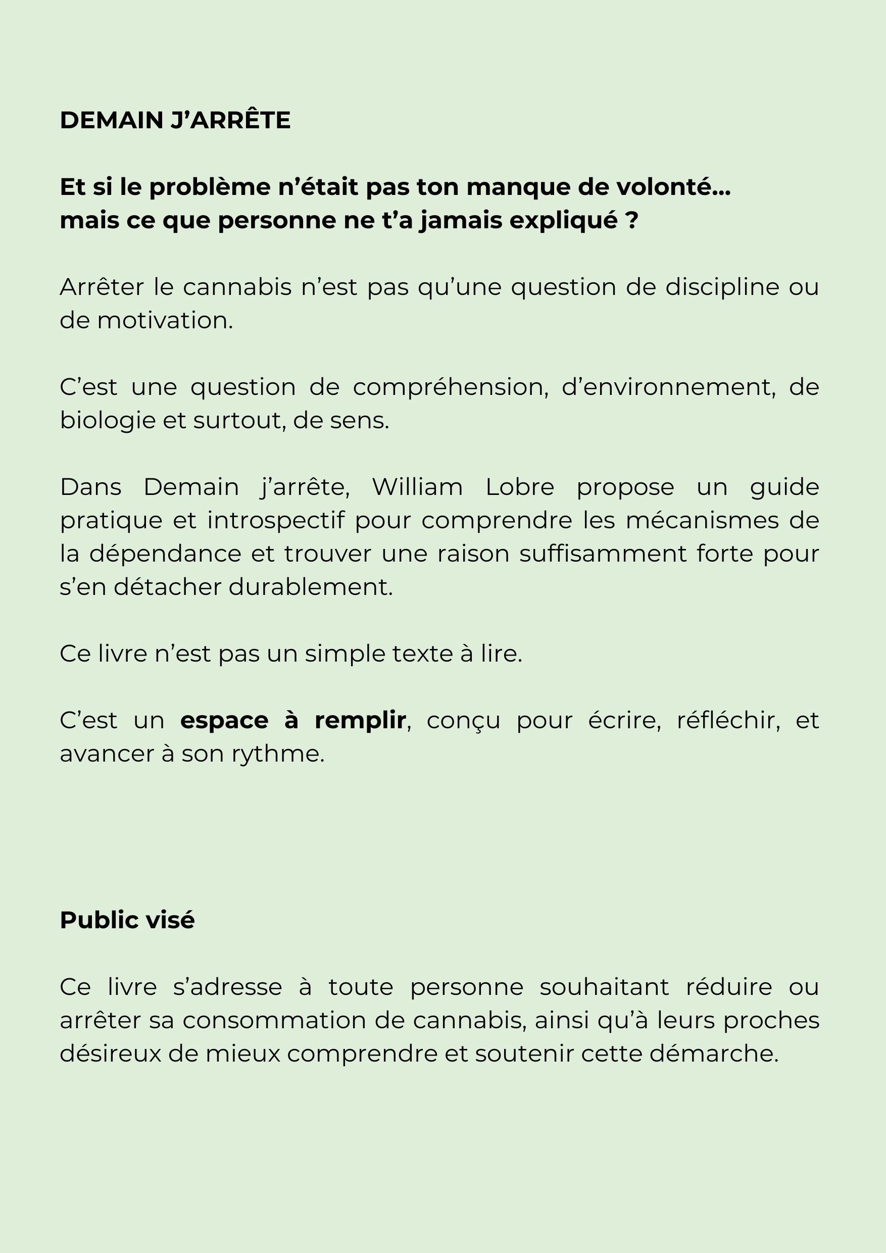 Dans Demain j’arrête, William Lobre propose un guide pratique et introspectif pour comprendre les mécanismes de la dépendance et trouver une raison suffisamment forte pour s’en détacher durablement.
