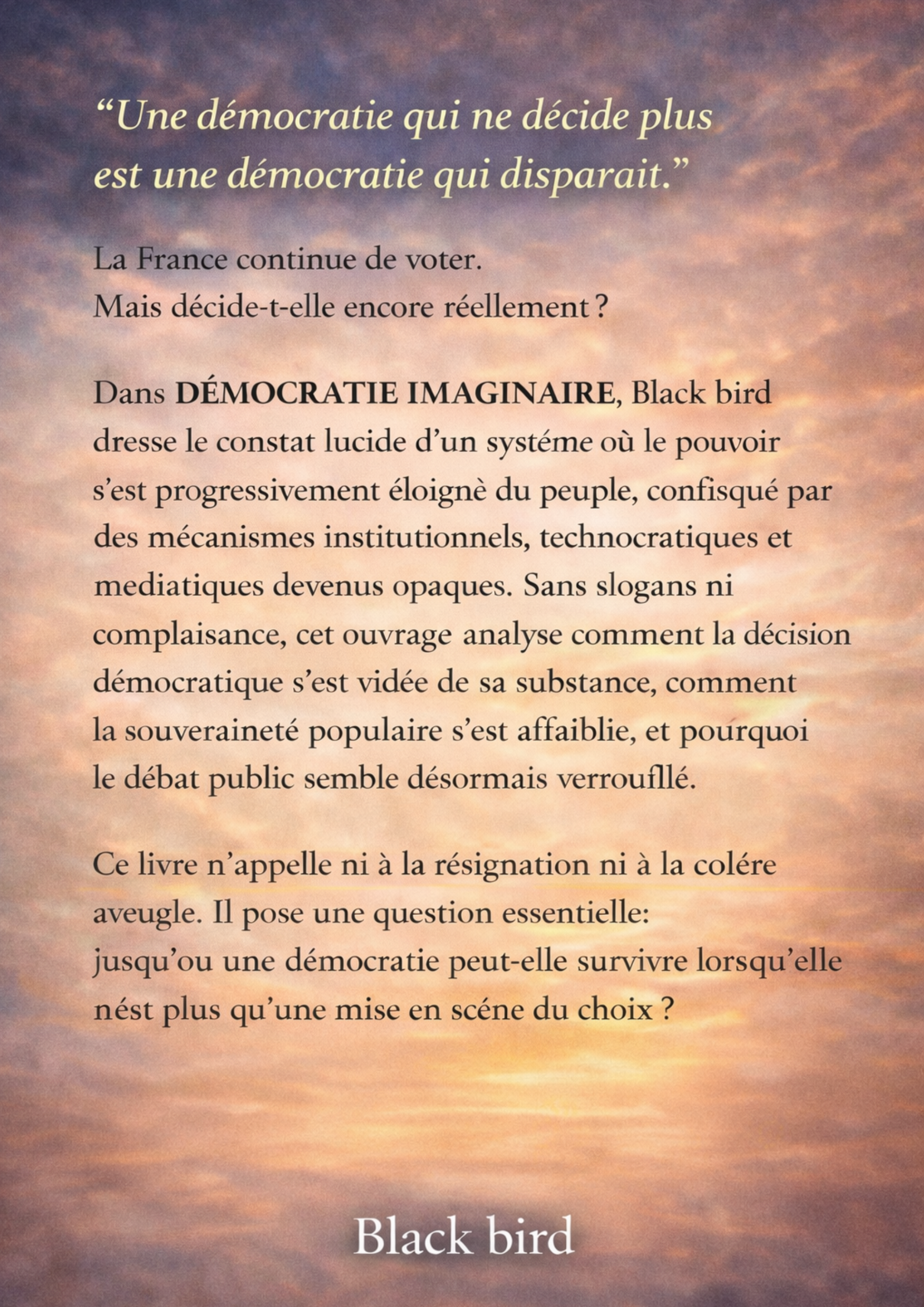 Dans DÉMOCRATIE IMAGINAIRE, Black bird dresse le constat lucide d’un système où le pouvoir s’est progressivement éloigné du peuple, confisqué par des mécanismes institutionnels, technocratiques et médiatiques devenus opaques.