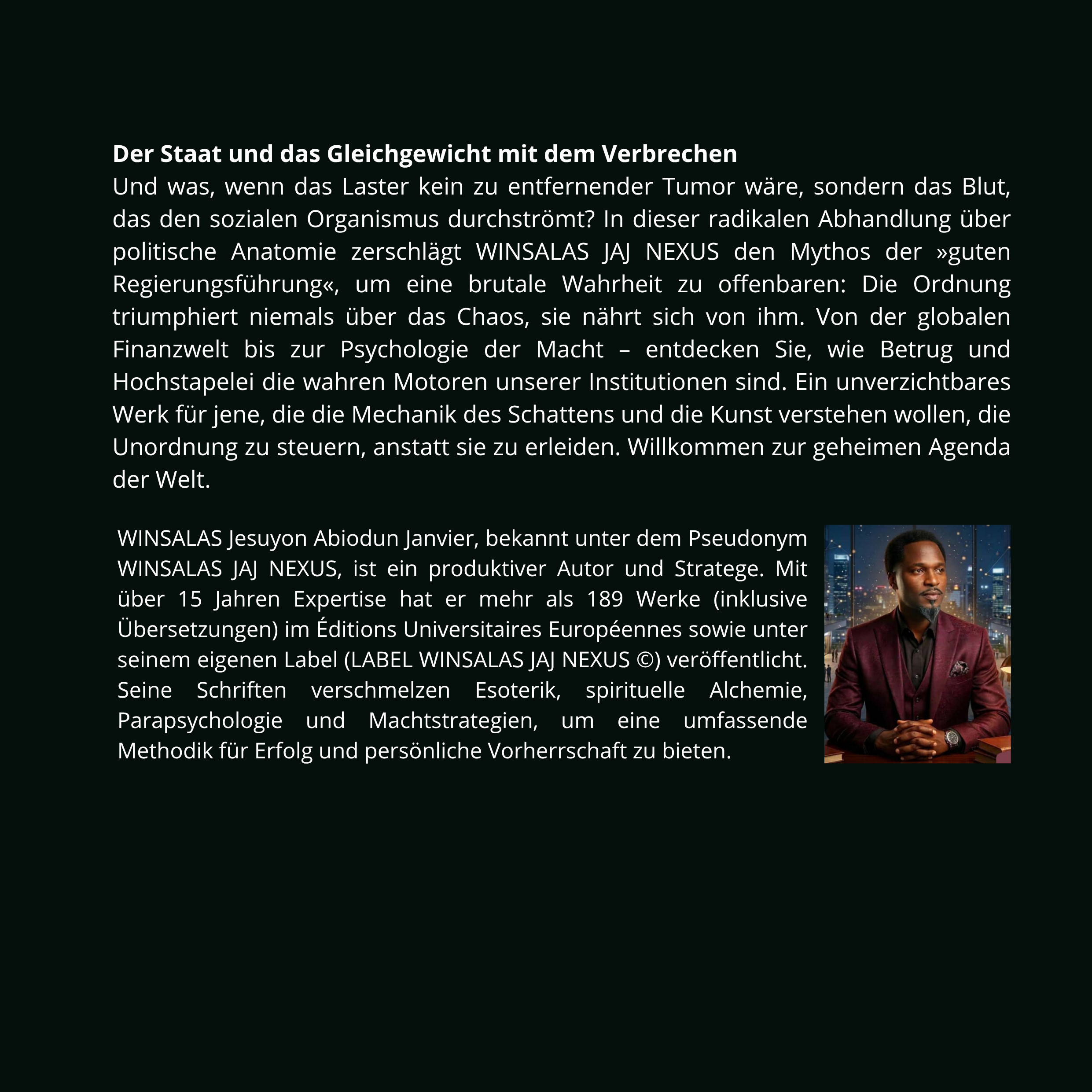 Und was, wenn das Laster kein zu entfernender Tumor wäre, sondern das Blut, das den sozialen Organismus durchströmt? In dieser radikalen Abhandlung über politische Anatomie zerschlägt WINSALAS JAJ NEXUS den Mythos der »guten Regierungsführung«, um eine brutale Wahrheit zu offenbaren: Die Ordnung triumphiert niemals über das Chaos, sie nährt sich von ihm. Von der globalen Finanzwelt bis zur Psychologie der Macht – entdecken Sie, wie Betrug und Hochstapelei die wahren Motoren unserer Institutionen sind. Ein unverzichtbares Werk für jene, die die Mechanik des Schattens und die Kunst verstehen wollen, die Unordnung zu steuern, anstatt sie zu erleiden.