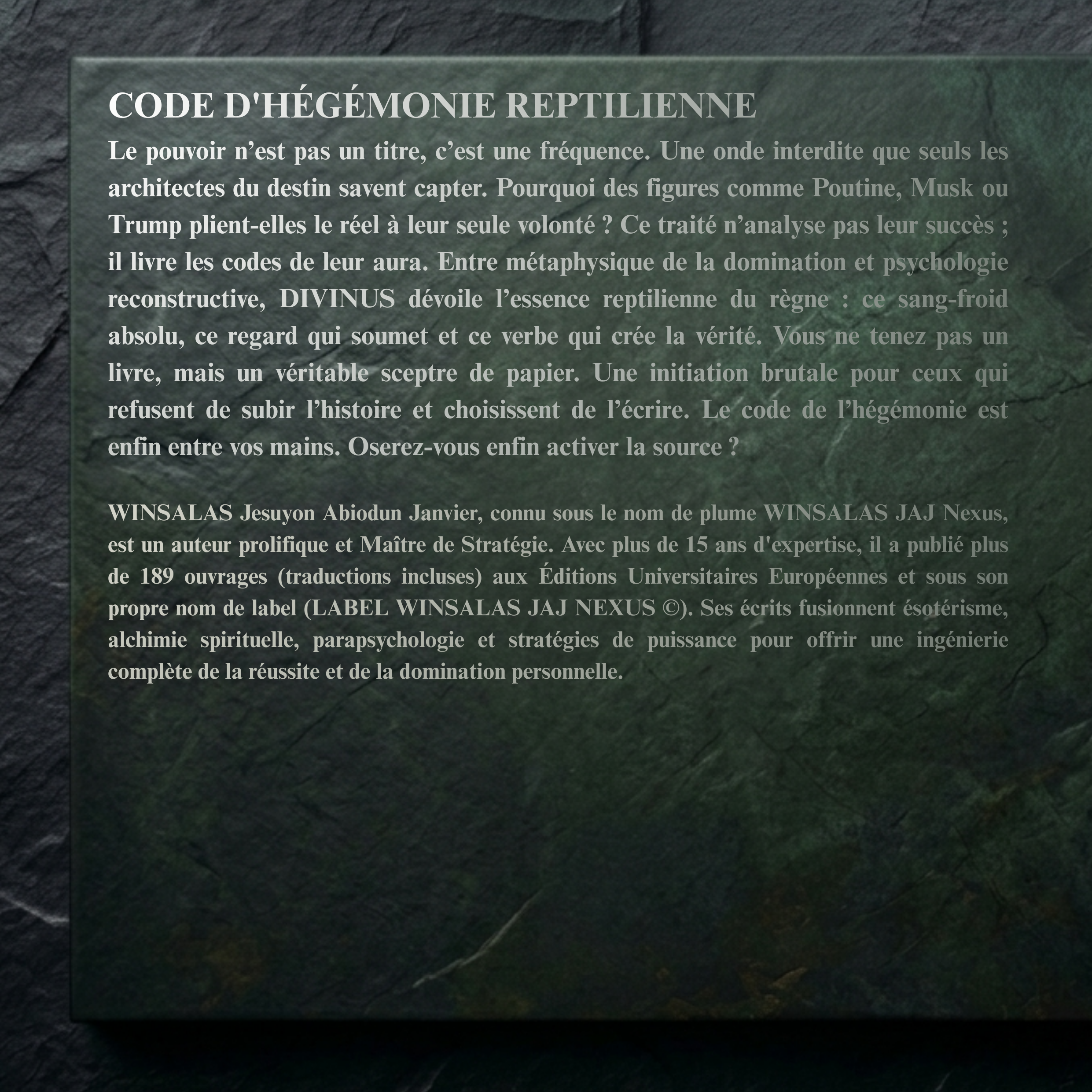 DIVINUS n'est pas un livre, c'est une arme de souveraineté. Ce traité brise les chaînes de la passivité pour activer votre fréquence de règne. Dominez le réel, soumettez l'histoire et devenez l'architecte de votre propre hégémonie. Radical et définitif.