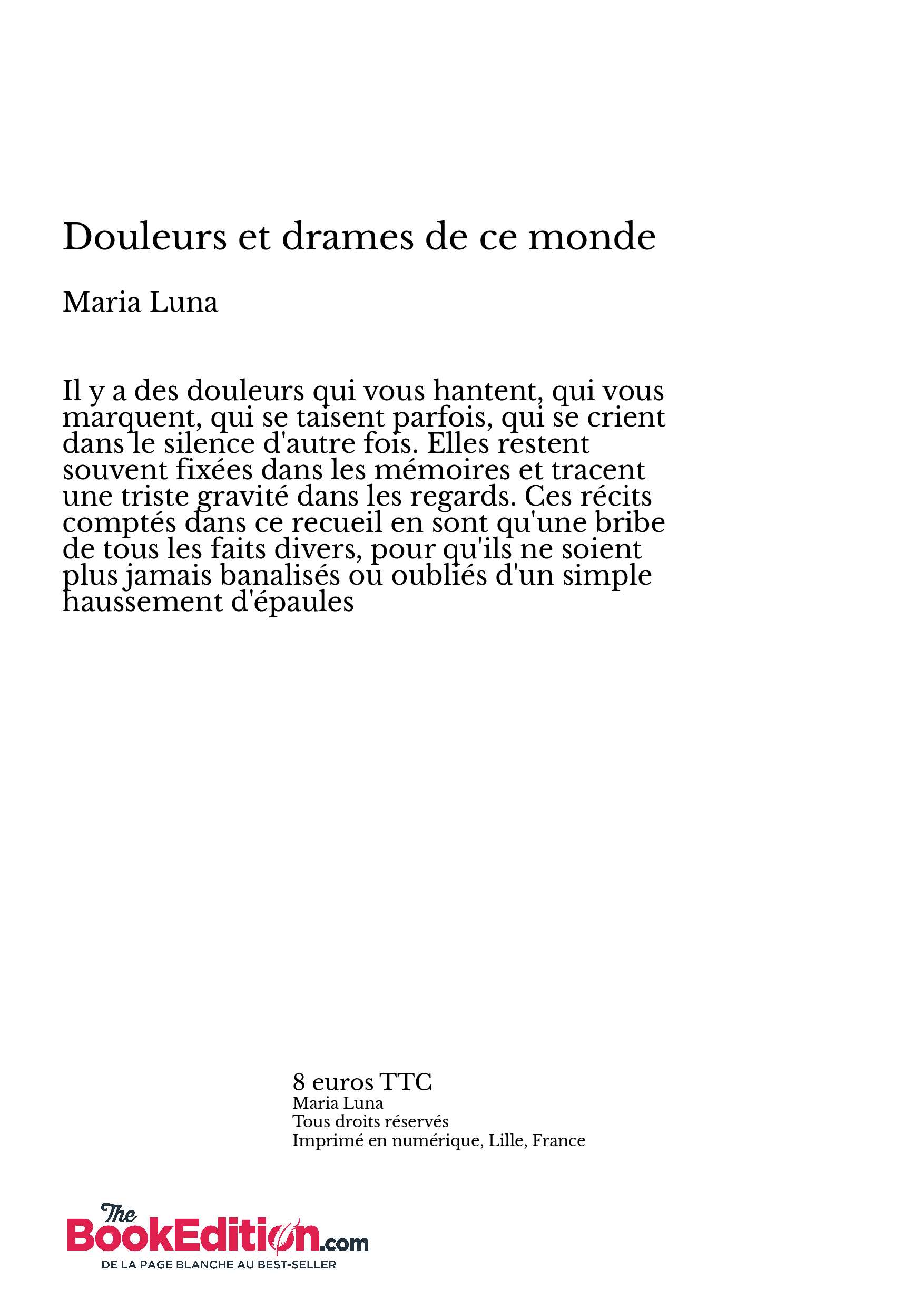 Il y a des douleurs qui vous hantent, qui vous marquent, qui se taisent parfois, qui se crient dans le silence d'autre fois. Elles restent souvent fixées dans les mémoires et tracent une triste gravité dans les regards. Ces récits comptés dans ce recueil en sont qu'une bribe de tous les faits divers, pour qu'ils ne soient plus jamais banalisés ou oubliés d'un simple haussement d'épaules