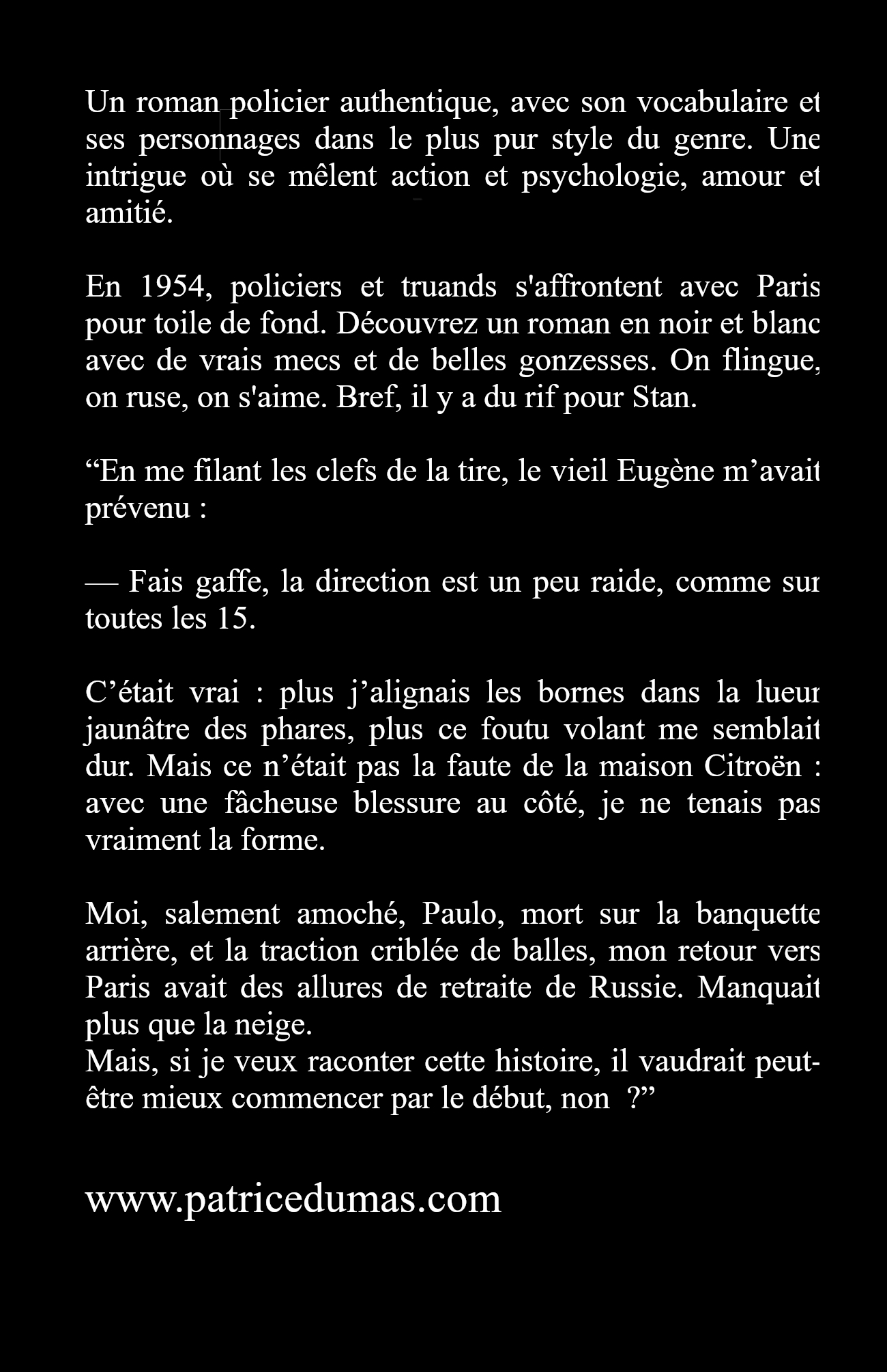En 1954, policiers et truands s'affrontent avec Paris pour toile de fond. Découvrez un roman en noir et blanc avec de vrais mecs et de belles gonzesses. On flingue, on ruse, on s'aime. Bref, il y a du rif pour Stan.