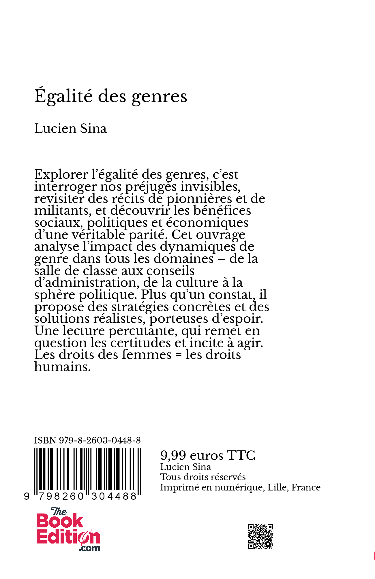 Explorer l’égalité des genres, c’est interroger nos préjugés invisibles, revisiter des récits de pionnières et de militants, et découvrir les bénéfices sociaux, politiques et économiques d’une véritable parité. Cet ouvrage analyse l’impact des dynamiques de genre dans tous les domaines – de la salle de classe aux conseils d’administration, de la culture à la sphère politique. Plus qu’un constat, il propose des stratégies concrètes et des solutions réalistes, porteuses d’espoir. Une lecture percutante, qui remet en question les certitudes et incite à agir. Les droits des femmes = les droits humains.