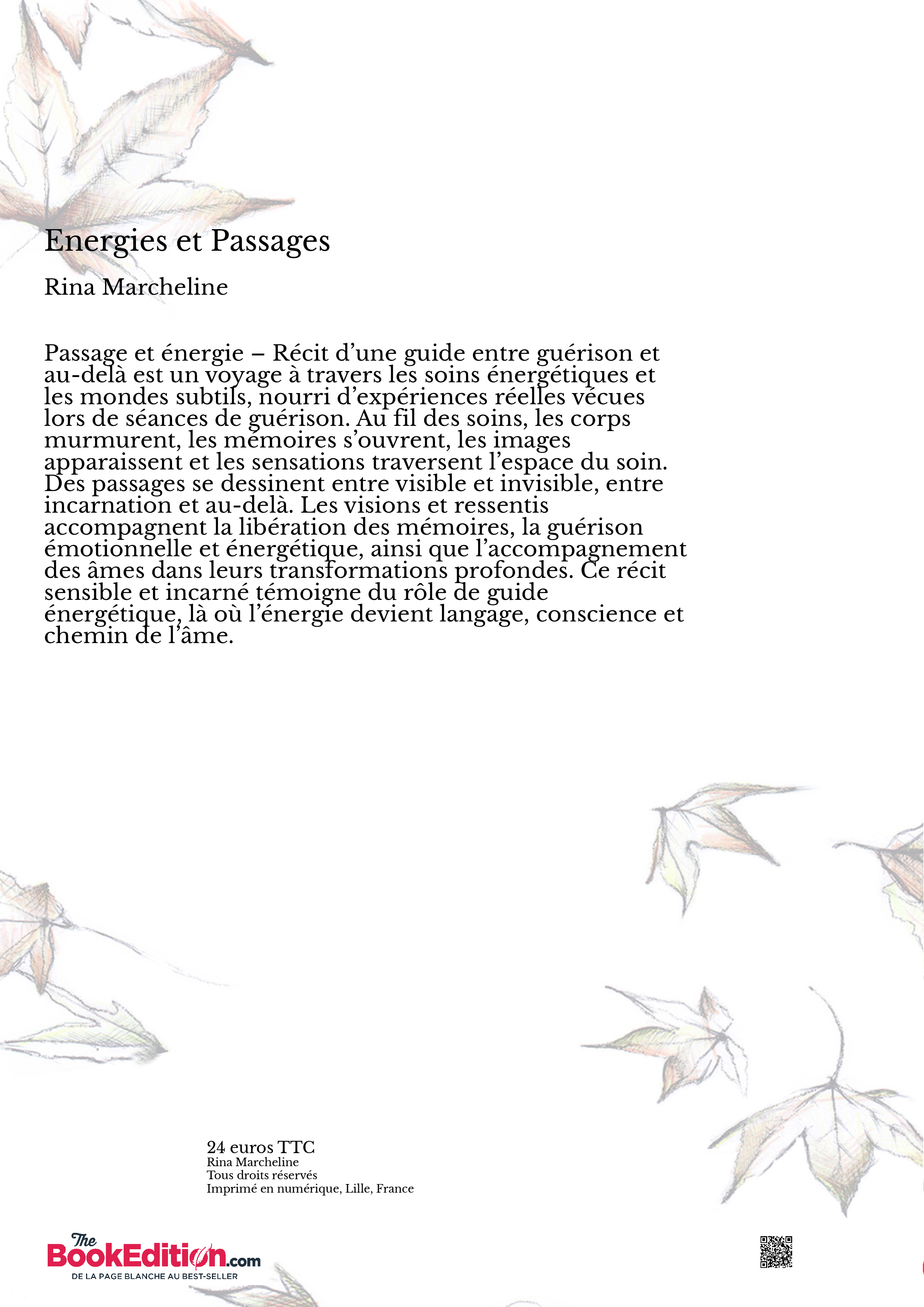 Passage et énergie – Récit d’une guide entre guérison et au-delà est un voyage à travers les soins énergétiques et les mondes subtils, nourri d’expériences réelles vécues lors de séances de guérison. Au fil des soins, les corps murmurent, les mémoires s’ouvrent, les images apparaissent et les sensations traversent l’espace du soin. Des passages se dessinent entre visible et invisible, entre incarnation et au-delà. Les visions et ressentis accompagnent la libération des mémoires, la guérison émotionnelle et énergétique, ainsi que l’accompagnement des âmes dans leurs transformations profondes. Ce récit sensible et incarné témoigne du rôle de guide énergétique, là où l’énergie devient langage, conscience et chemin de l’âme.
