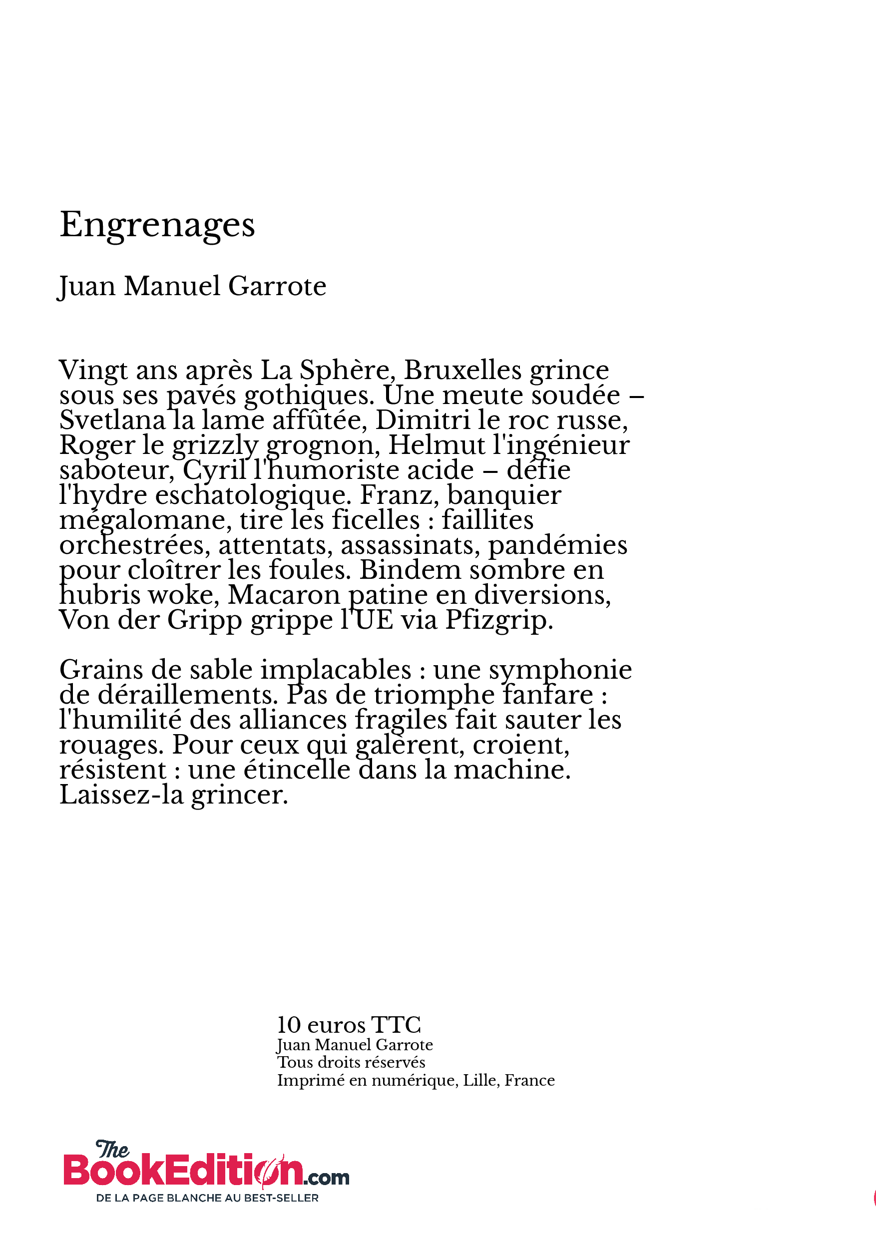 Vingt ans après La Sphère, Bruxelles grince sous ses pavés gothiques. Une meute soudée – Svetlana la lame affûtée, Dimitri le roc russe, Roger le grizzly grognon, Helmut l'ingénieur saboteur, Cyril l'humoriste acide – défie l'hydre eschatologique. Franz, banquier mégalomane, tire les ficelles : faillites orchestrées, attentats, assassinats, pandémies pour cloîtrer les foules. Bindem sombre en hubris woke, Macaron patine en diversions, Von der Gripp grippe l'UE via Pfizgrip.