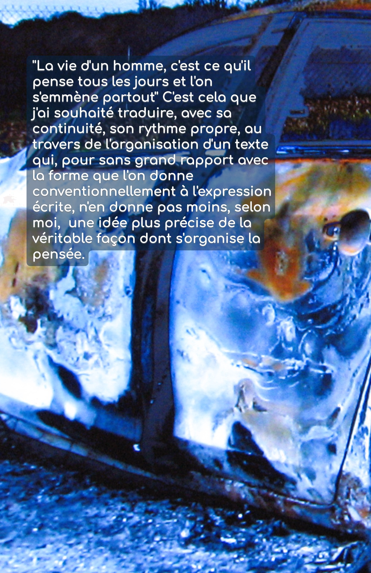 ''La vie d'un homme, c'est ce qu'il pense tous les jours et l'on s'emmène partout'' C'est cela que j'ai souhaité traduire, avec sa continuité, son rythme propre, au travers de l'organisation d'un texte qui, pour sans grand rapport avec la forme que l'on donne conventionnellement à l'expression écrite, n'en donne pas moins, selon moi, une idée plus précise de la véritable façon dont s'organise la pensée. Conan Doyle décrit cela très bien, qui a d'ailleurs inspiré Kafka, comme une arborescence aux innombrables embranchements où l'esprit passe infatigablement d'une branche l'autre, sans souci de continuité s'il n'y prend garde...Ceci dit accrochez-vous, ça risque d'en décoiffer plus d'un.