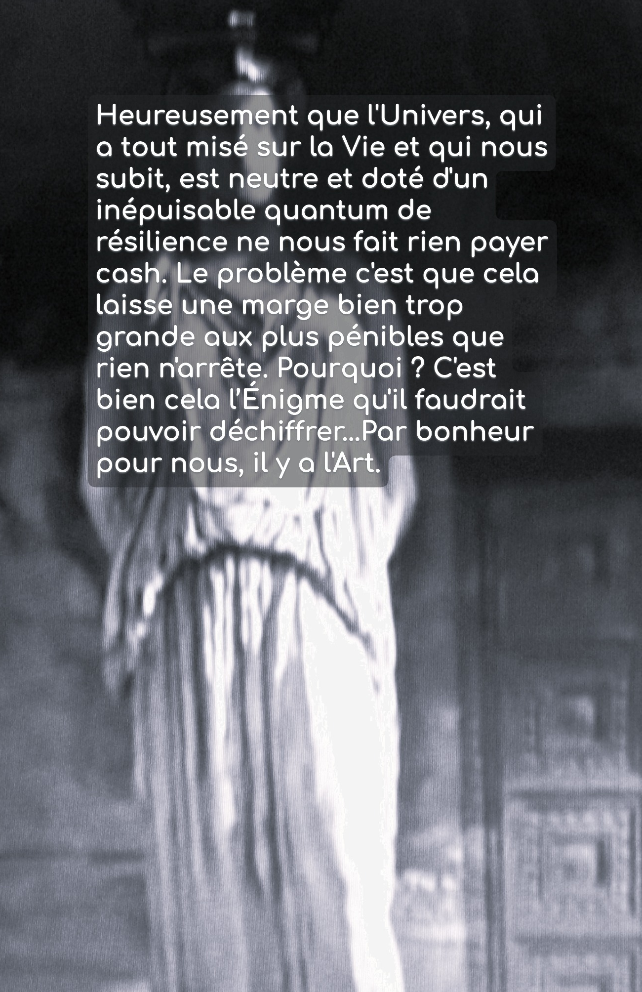 Heureusement que l'Univers, qui a tout misé sur la Vie et qui nous subit, est neutre et doté d'un inépuisable quantum de résilience ne nous fait rien payer cash. Le problème c'est que cela laisse une marge bien trop grande aux plus pénibles que rien n'arrête. Pourquoi ? C'est bien cela l’Énigme qu'il faudrait pouvoir déchiffrer...Par bonheur pour nous il y a l'Art.