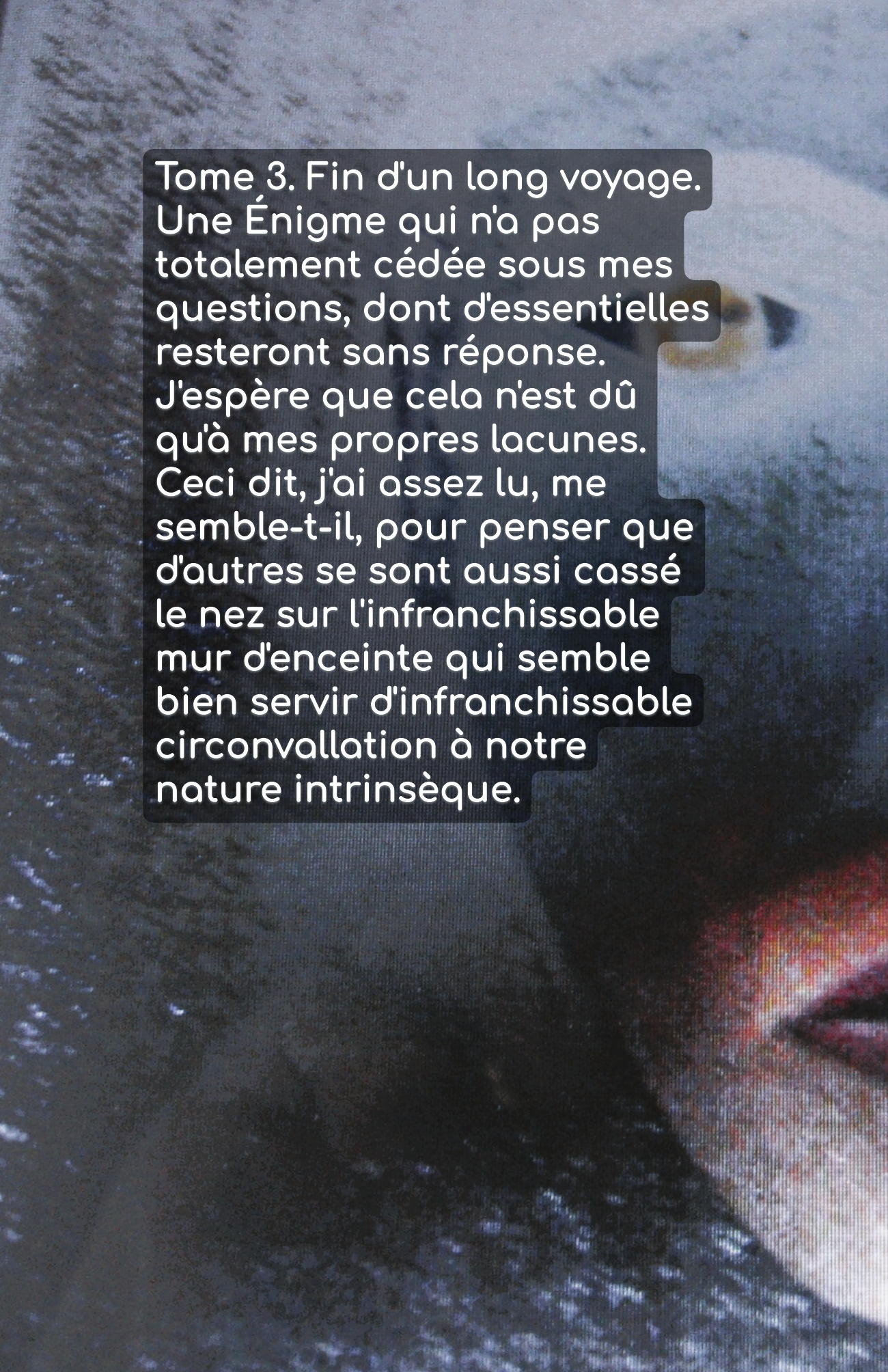 Tome 3. Fin d'un long voyage. Une Énigme qui n'a pas totalement cédée sous mes questions, dont d'essentielles resteront sans réponse. J'espère que cela n'est dû qu'à mes propres lacunes. Ceci dit, j'ai assez lu, me semble-t-il, pour penser que d'autres se sont aussi cassé le nez sur l'infranchissable mur d'enceinte qui semble bien servir d'infranchissable circonvallation à notre nature intrinsèque. Créature cernée par les limites que lui a tracée l'Organisation Achevée du Monde. Quelque chose qui est régie selon d'intangibles Lois Universelles, comme insupportables Réalités au commun des mortels et aux stupéfiantes présomptions que ses ruées dans la fiction ne mènent nulle part. Dommage.