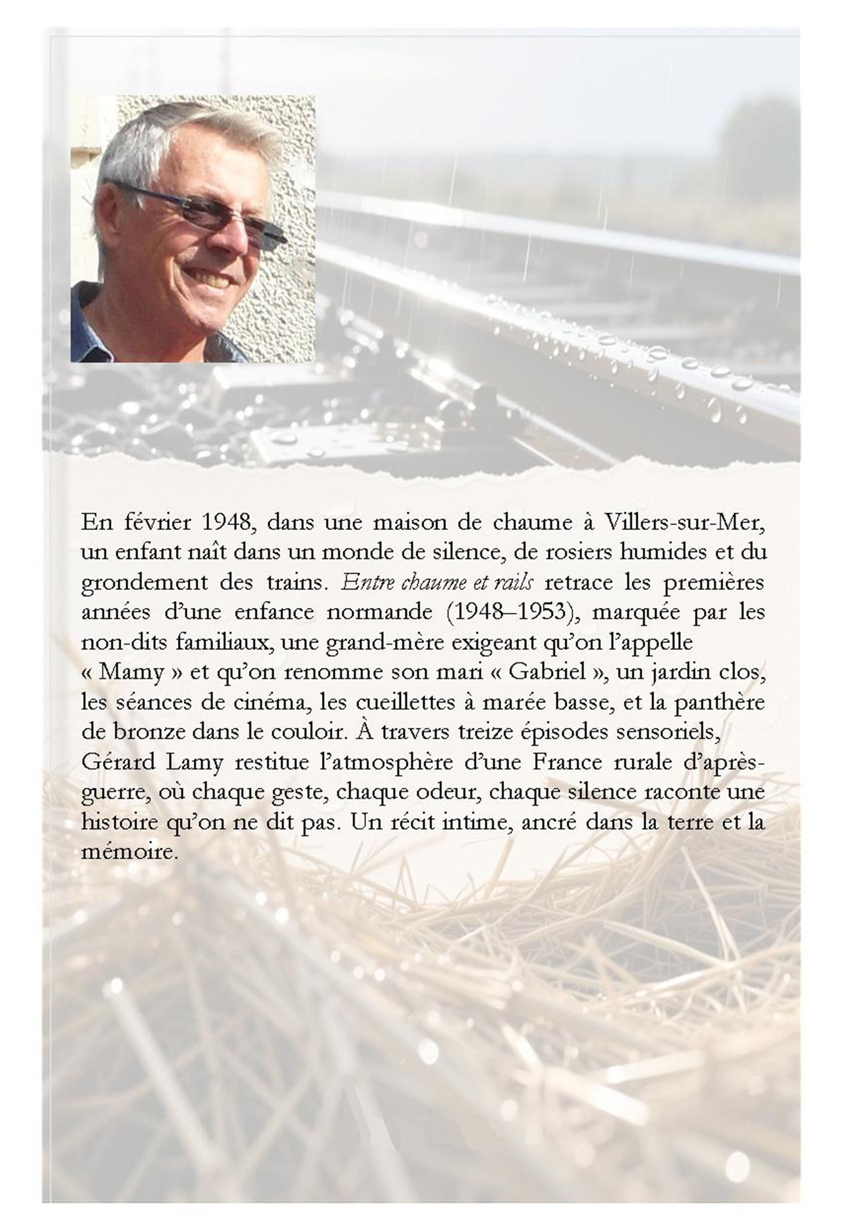 En février 1948, dans une maison de chaume à Villers-sur-Mer, un enfant naît dans un monde de silence, de rosiers humides et du grondement des trains. Entre chaume et rails retrace les premières années d’une enfance normande (1948–1953), marquée par les non-dits familiaux, une grand-mère exigeant qu’on l’appelle « Mamy » et qu’on renomme son mari « Gabriel », un jardin clos, les séances de cinéma, les cueillettes à marée basse, et la panthère de bronze dans le couloir. À travers treize épisodes sensoriels, Gérard Lamy restitue l’atmosphère d’une France rurale d’après-guerre, où chaque geste, chaque odeur, chaque silence raconte une histoire qu’on ne dit pas. Un récit intime, ancré dans la terre et la mémoire.