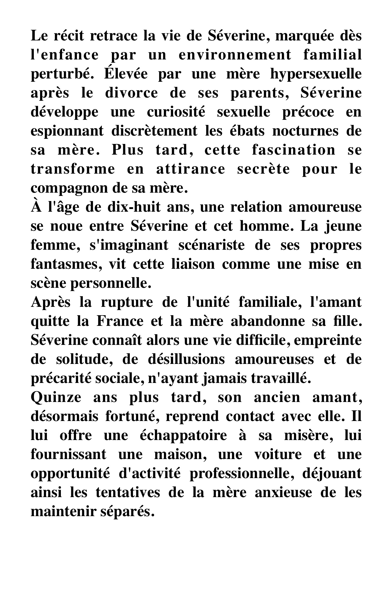 Après l’éclatement de la cellule familiale, Séverine âgée de 19 ans se retrouva coupée du monde, de sa mère et de son compagnon, duquel elle tomba secrètement amoureuse entretenant tous les deux une trépidante et complice relation sexuelle. Financièrement démunie, elle vécut des années malheureuses en compagnie d’hommes pour lesquels elle n’éprouvait aucun intérêt.15 ans après, revenant de l’étranger où il accumula une considérable fortune, son amant et amour de toujours revint vers elle pour lui changer drastiquement sa vie. Il lui offrira une vie luxueuse lui permettant de poursuivre la réalisation de ses rêves et de ses fantasmes qu'elle vécut 15 ans auparavant, devenant la fondatrice d'un club très privé...