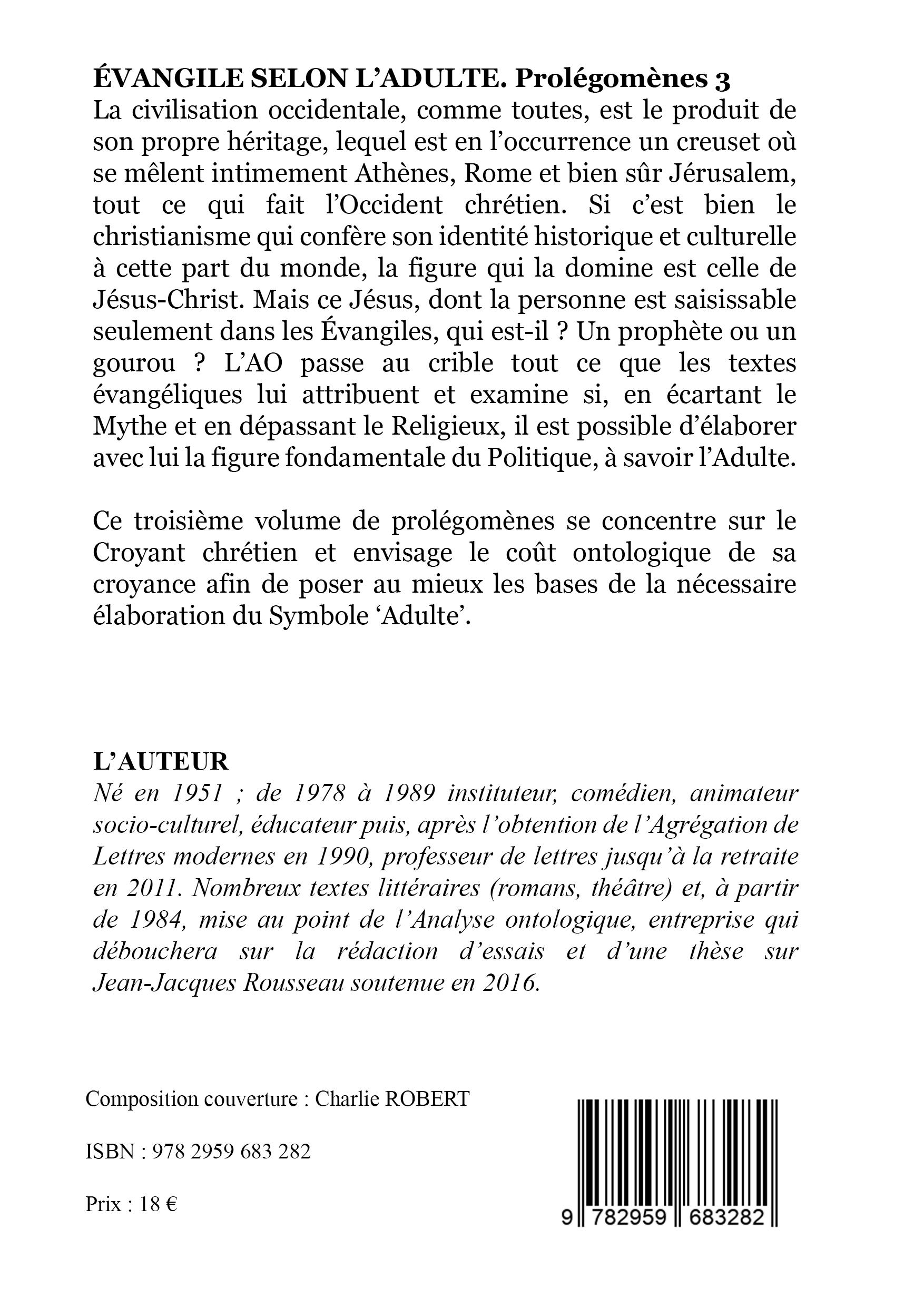 La civilisation occidentale, est le produit de son propre héritage, lequel mêle intimement Athènes, Rome et bien sûr Jérusalem, tout ce qui fait l’Occident chrétien. Si le christianisme confère son identité à cette part du monde, la figure qui la domine est celle de Jésus-Christ. Mais ce Jésus, qui est-il ? Un prophète ou un gourou ? L’AO étudie le personnage et examine si, en écartant le Mythe et en dépassant le Religieux, il est possible d’élaborer avec lui la figure fondamentale du Politique, à savoir l’Adulte.