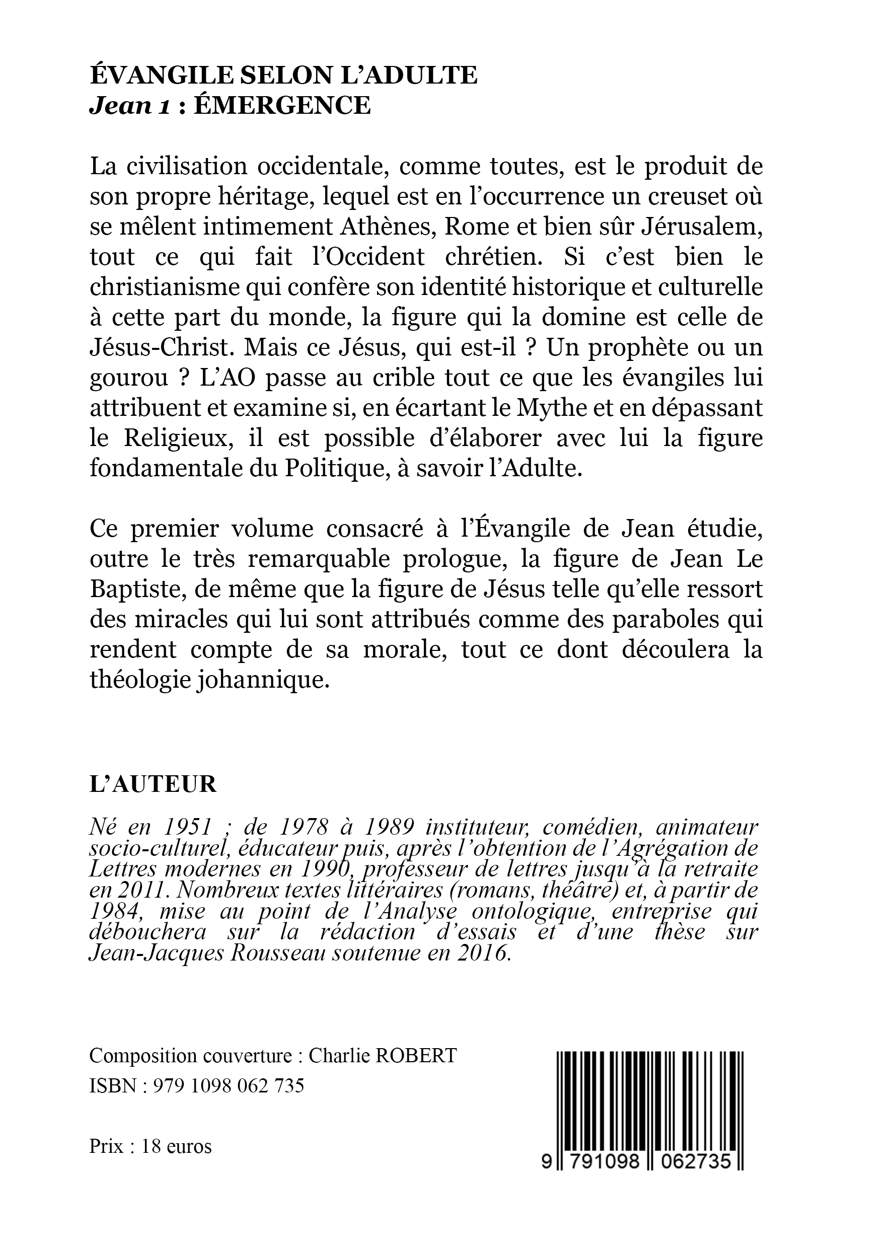 La civilisation occidentale est le produit d'un héritage où se mêlent intimement Athènes, Rome et Jérusalem, tout ce qui fait l’Occident chrétien. Le christianisme conférant son identité historique et culturelle à cette part du monde, la figure qui la domine est celle de Jésus-Christ. Mais ce Jésus, qui est-il ? Prophète ou gourou ? L’AO examine si, en écartant le Mythe et en dépassant le Religieux, il est possible d’élaborer avec lui la figure fondamentale du Politique, à savoir l’Adulte.
